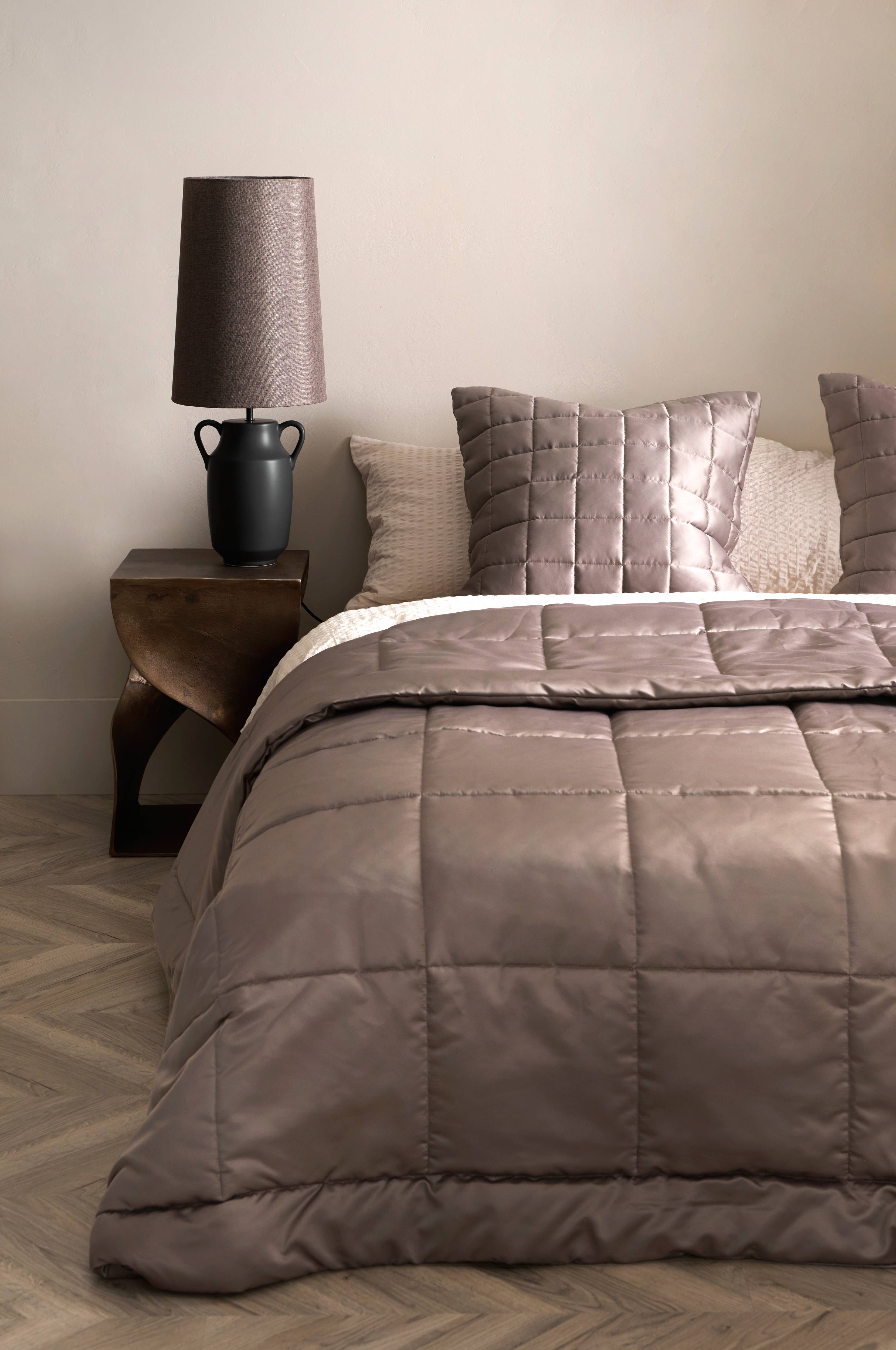 Rutquiltat överkast med bård runt om. Glansig yta som ger en lyxig känsla.
