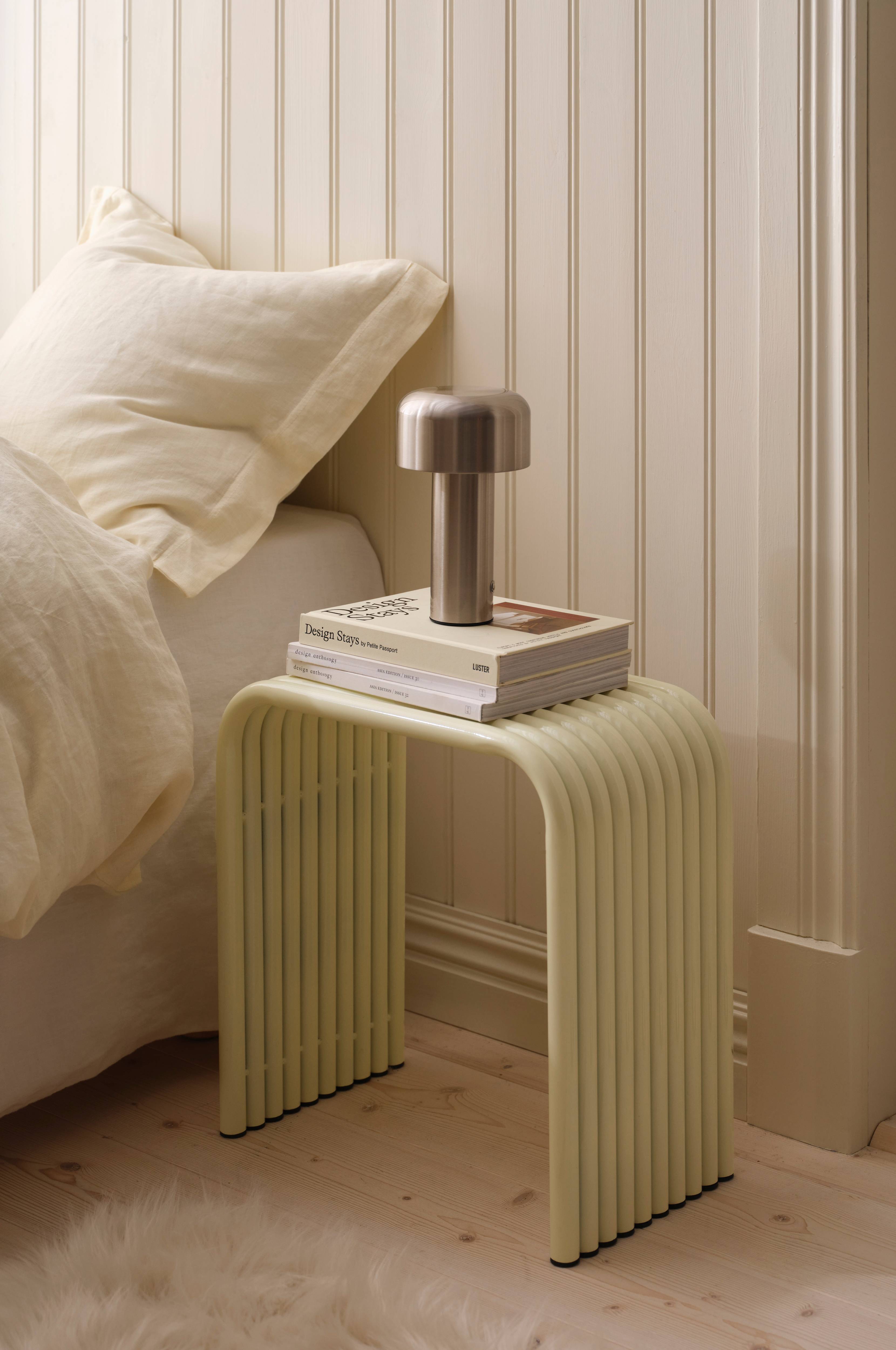 Pall/sidobord i metall med sammansatta rör som bildar ett randmönster. Maxvikt 100 kg. Plasttassar undertill. Levereras monterad.