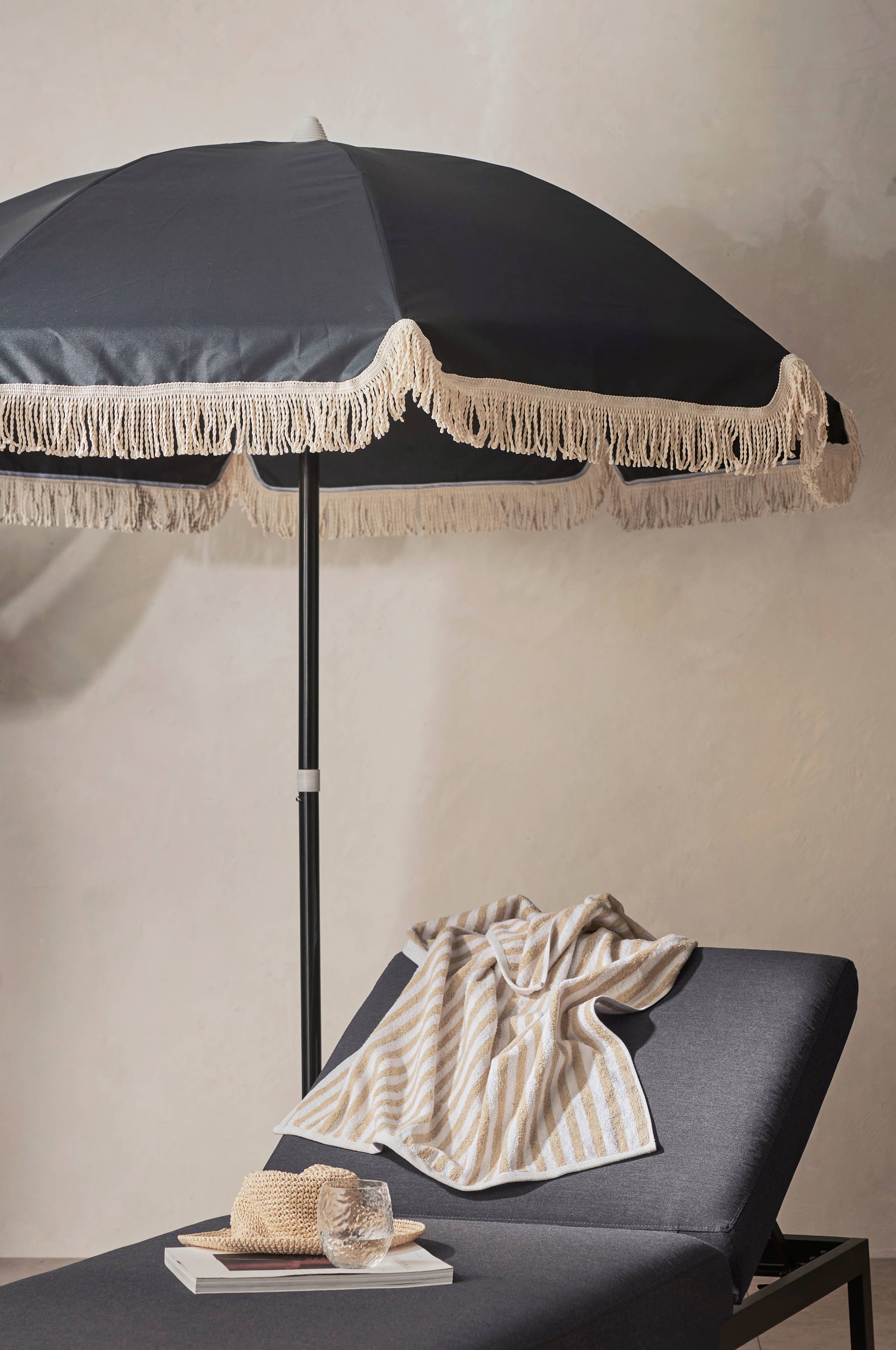 Parasoll med glatt, coatat tyg av 100% polyester och bomullsfransar. Svart stång i metall som kan vinklas. Skruvfot. Utvändig diameter på stången 3,5 cm. Enklare montering.