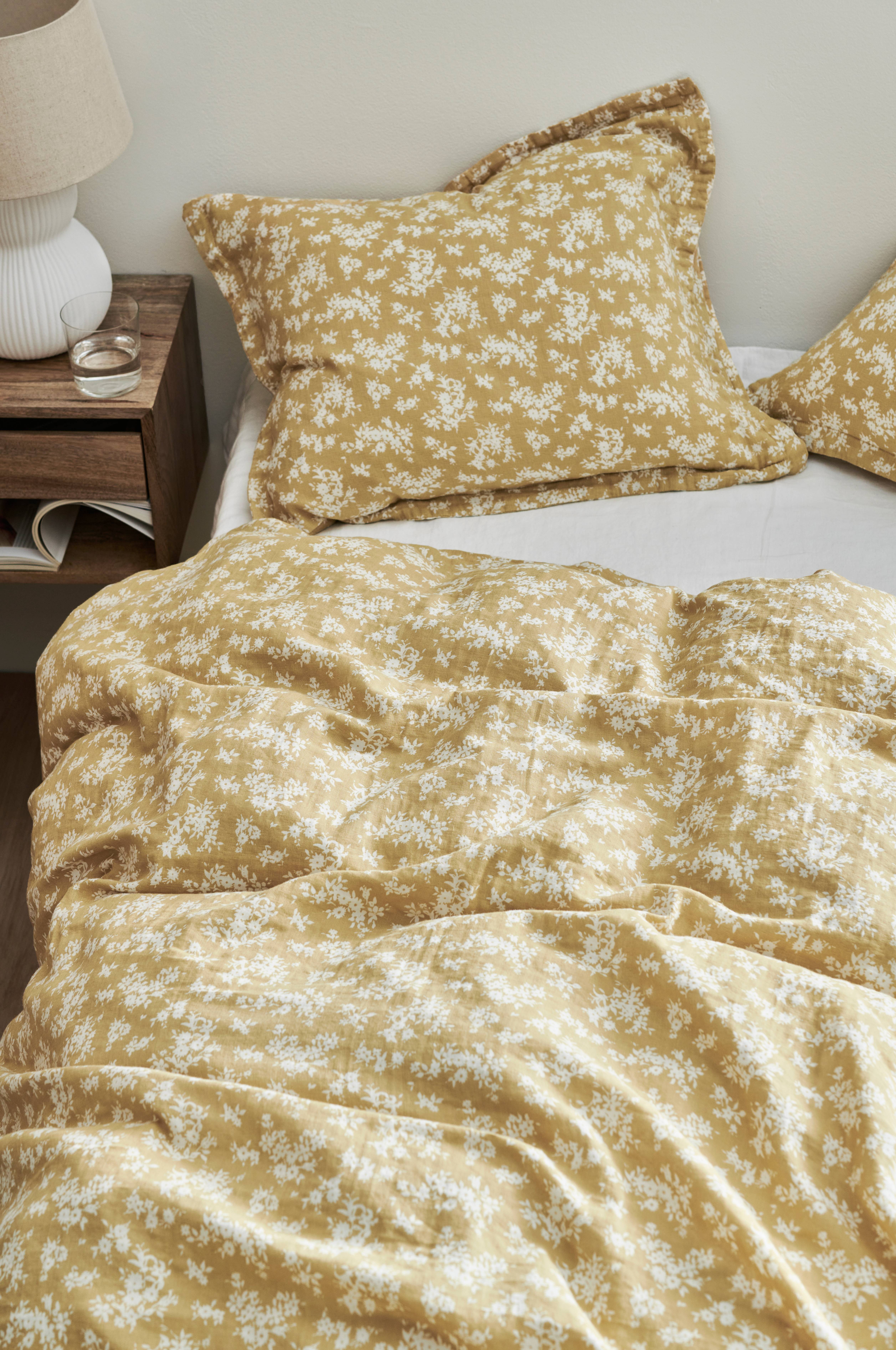Påslakanset av tvättad, ekologisk bomullsmuslin i 2 lager med tryckt mönster. Påslakanet har knappar i nederkanten. Inga handhål. Örngottet har 2,5 cm vinge runt om. Trådtäthet 230 TC.