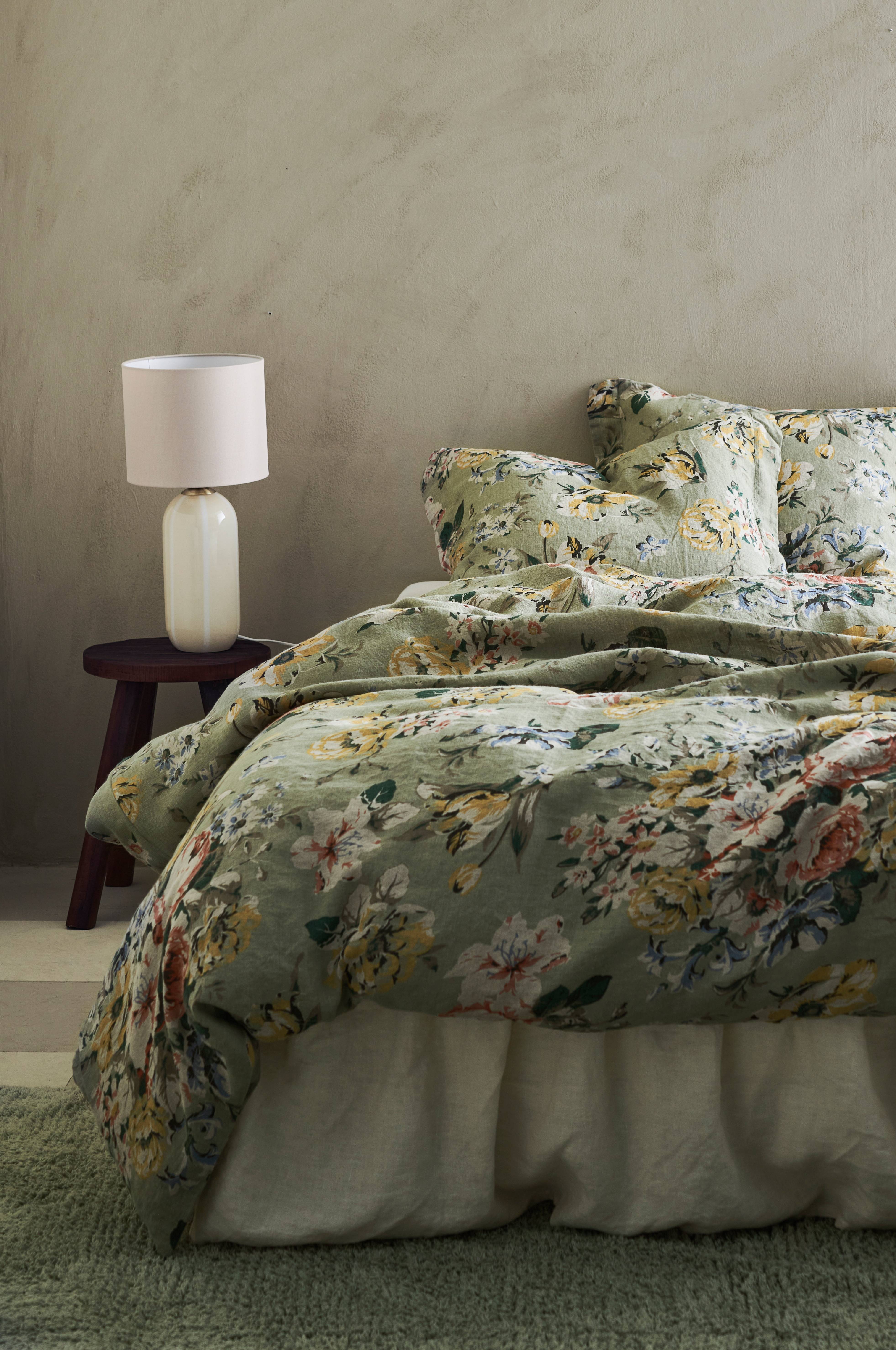 Påslakanset i vintagetvättad linnekvalitet av franskt lin med tryckt rosmönster på synlig linnebotten. Påslakanet har tryckknappar i nederkanten. Inga handhål. Örngott med 5 cm vinge på kortsidorna. Setet innehåller 1 påslakan 150x200 cm (till enkeltäcke) och 1 örngott 50x60 cm+vinge.