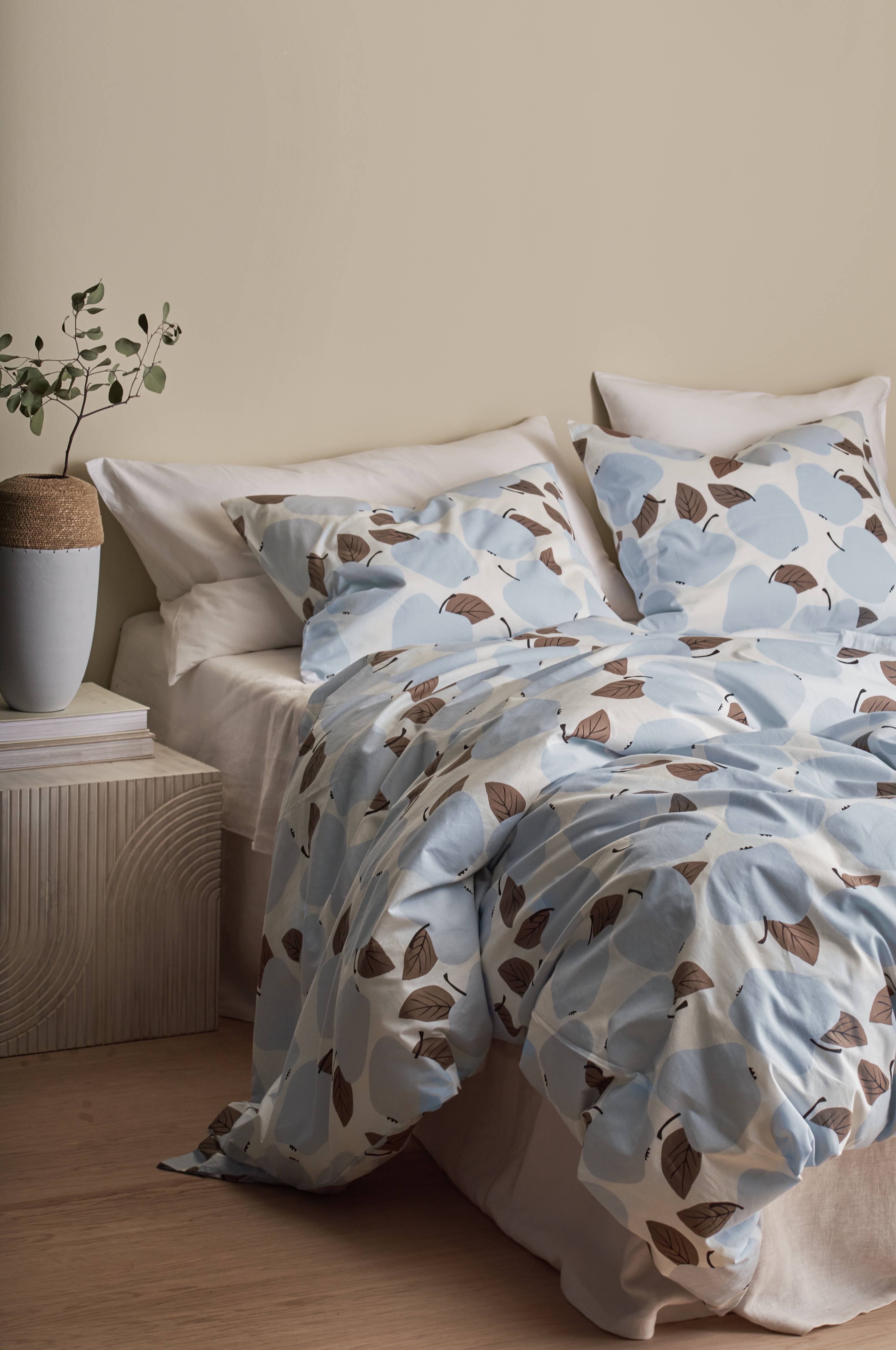 Påslakanset i bomull med tryckt mönster. Trådtäthet 144 TC. Påslakan med handhål. Setet levereras i en tygbag i samma kvalitet.