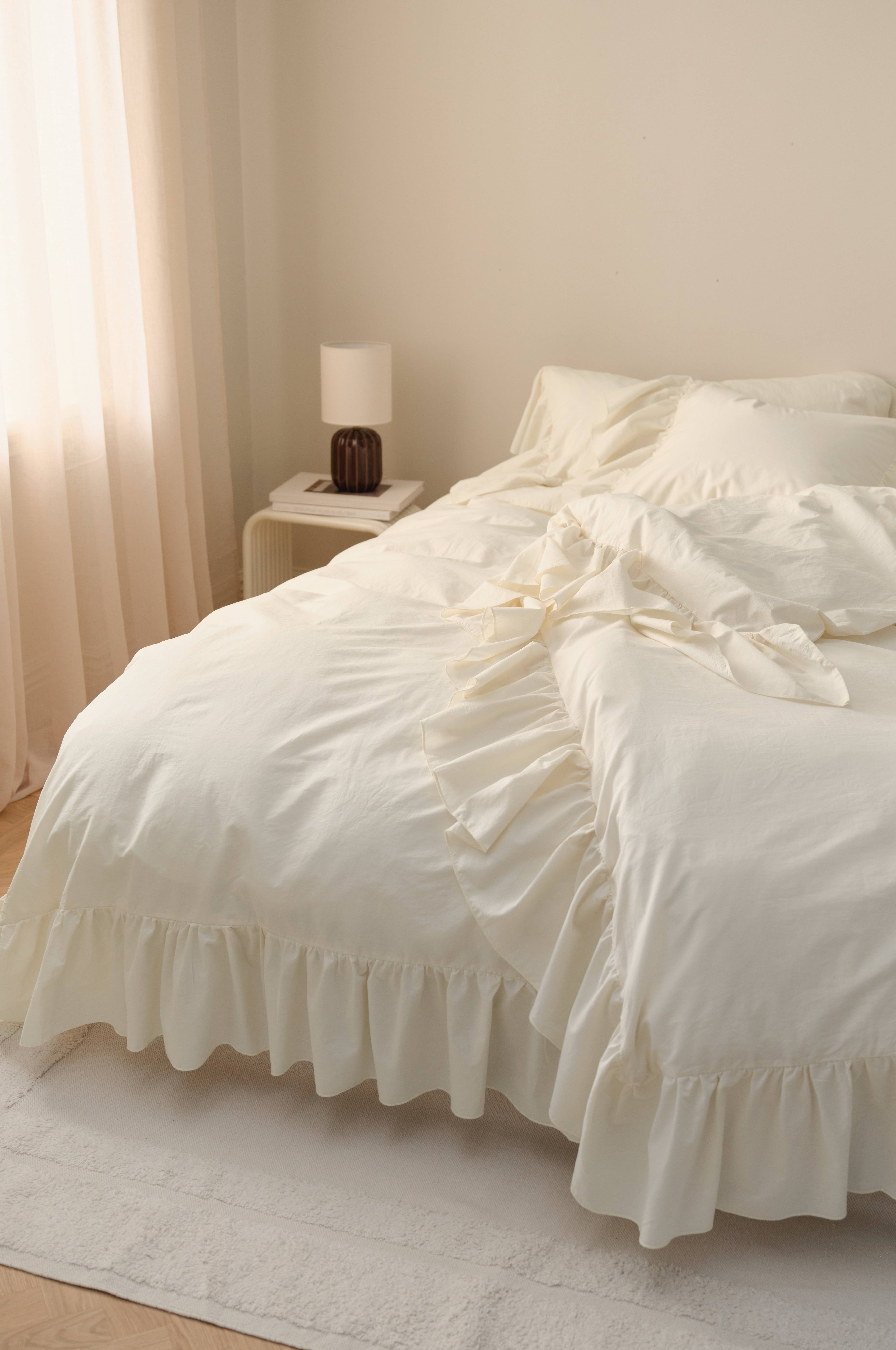 • Påslakanset i mjuk, tvättad bomull • Tryckknappar i plast i nederkanten på påslakanet • 22 cm volang på 3 sidor med overlockad kant • Trådtäthet: 144 TC. ( Ju högre trådantal, desto högre kvalitet) • 2-dels set: 1 påslakan 150x210 cm (till enkeltäcke) med 1 örngott 50x60 cm