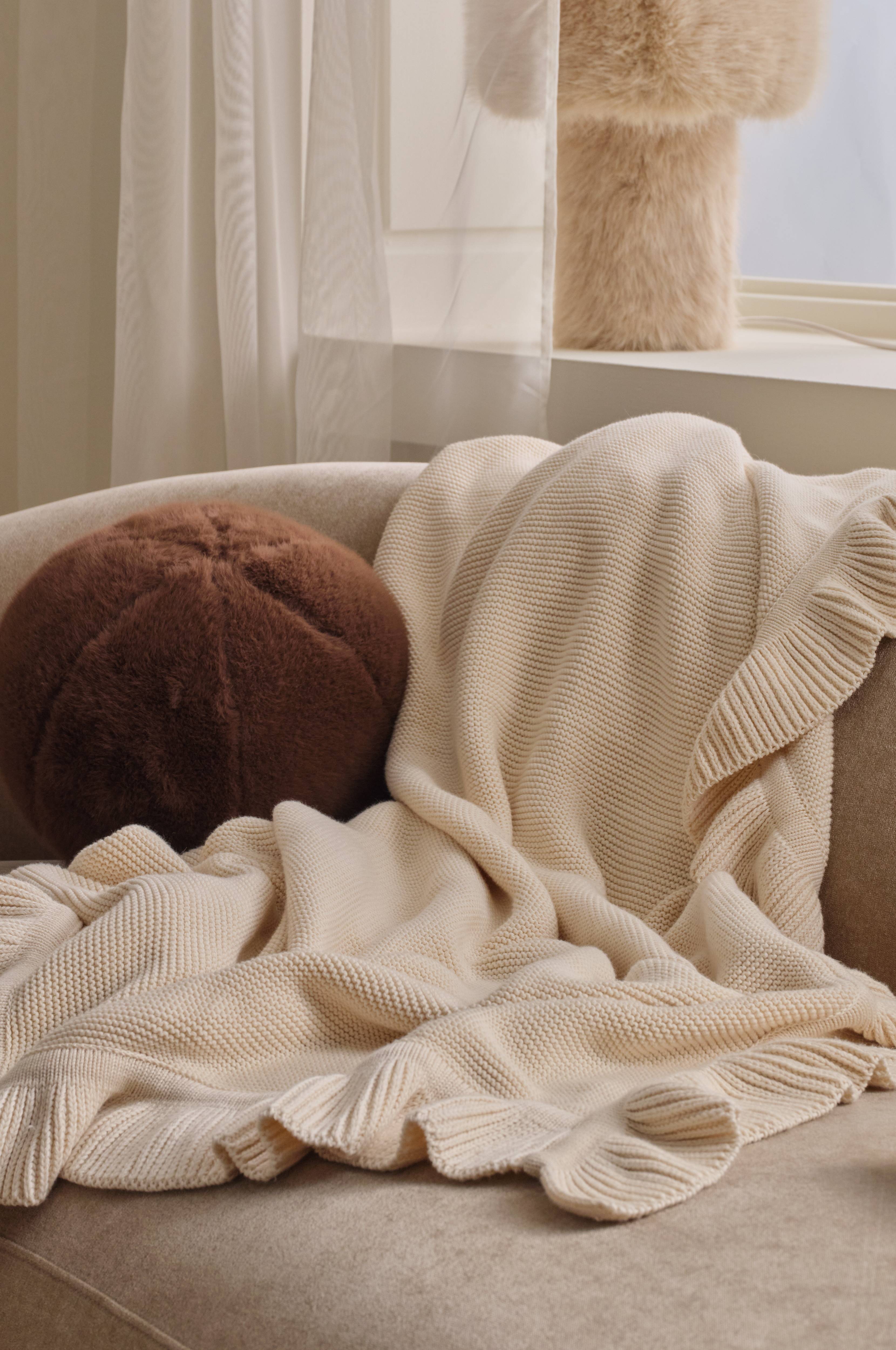 • Stickad, mjuk pläd i bomull• Stickad volang runt om