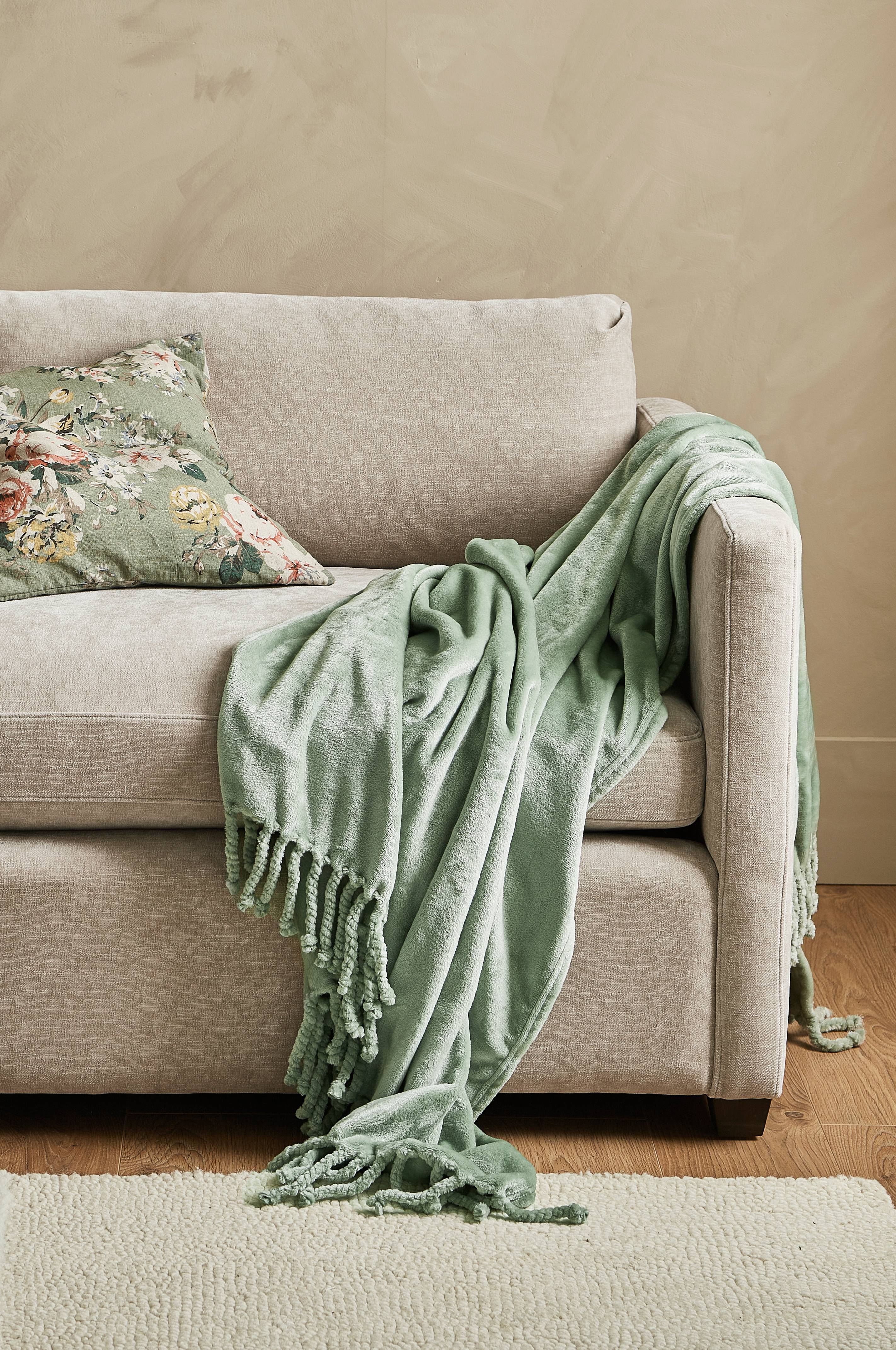 Pläd i mjuk och skön fleece med lätt lyster och handgjorda fransar. Stl 130x170 cm + 8 cm fransar på varje kortsida.