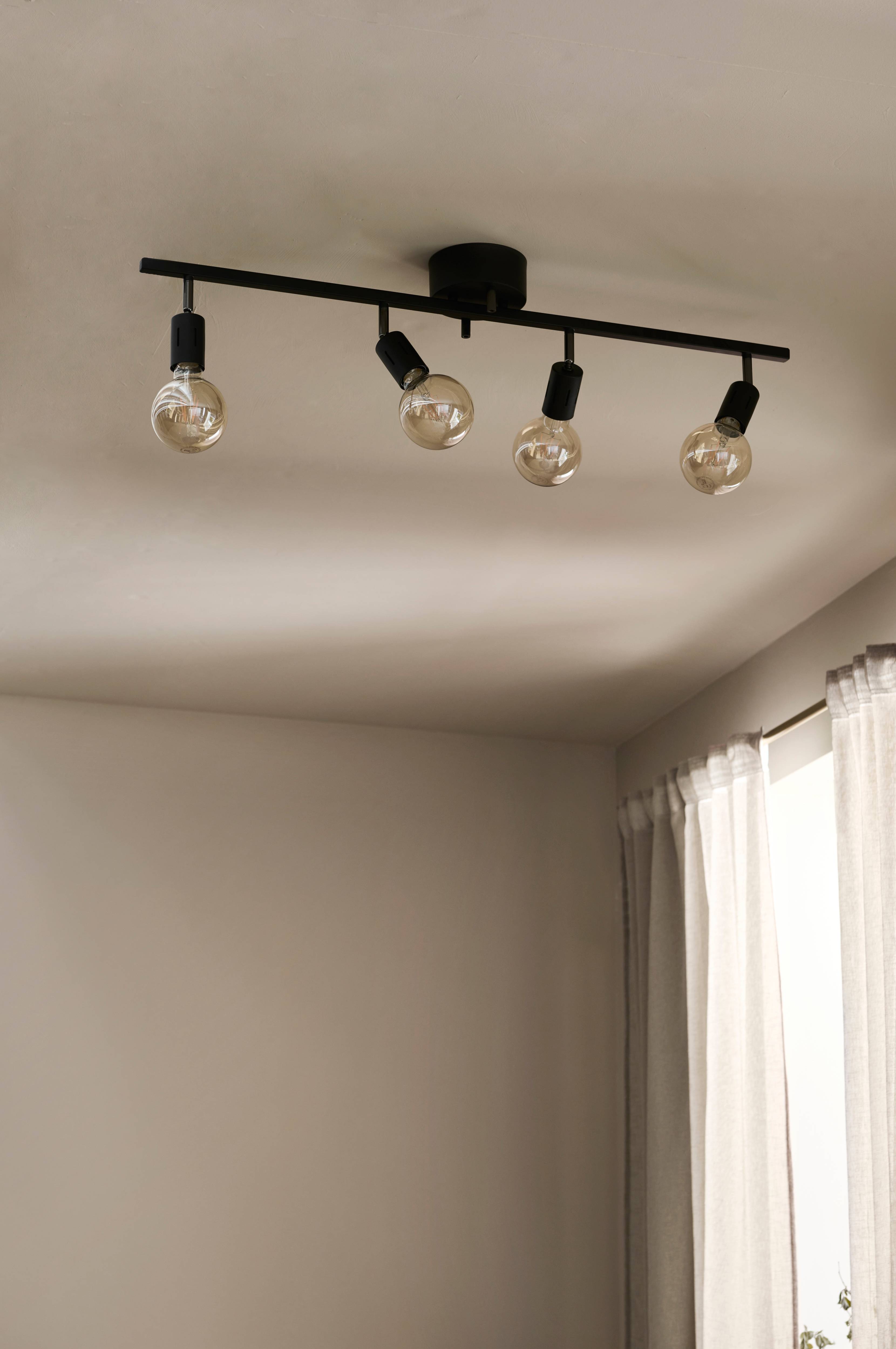 Plafond av metall med 4 ställbara lampor. Kan justeras fritt. Bredd 90 cm, höjd 19,5 cm. Takkoppens diameter 13 cm. Monteras med krokupphäng. 4xE27.