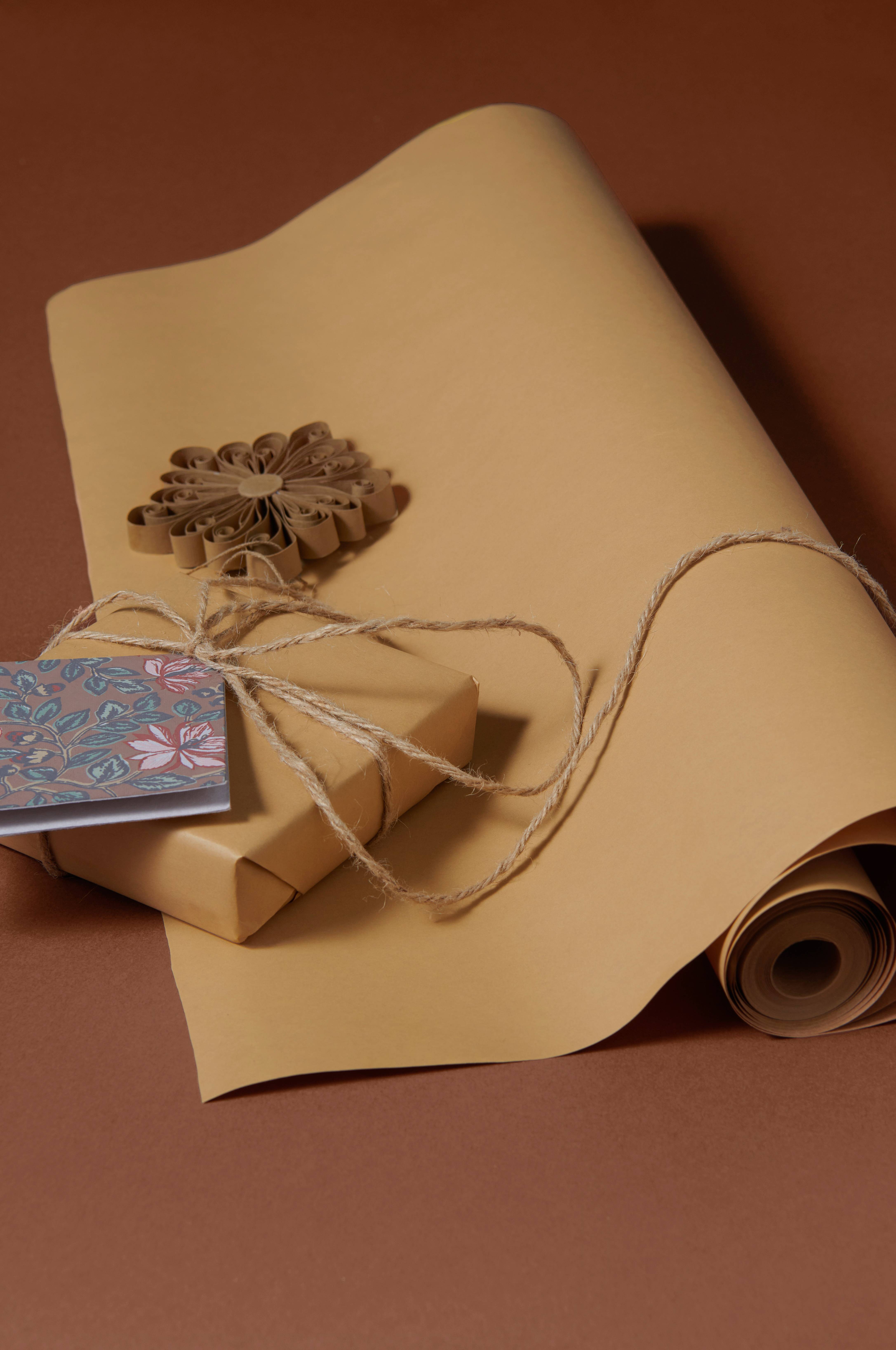 Tryckt, enfärgat matt brunpapper i kraftig kvalitet. 80 g. Bredd 57 cm. Längd per rulle 10 meter.