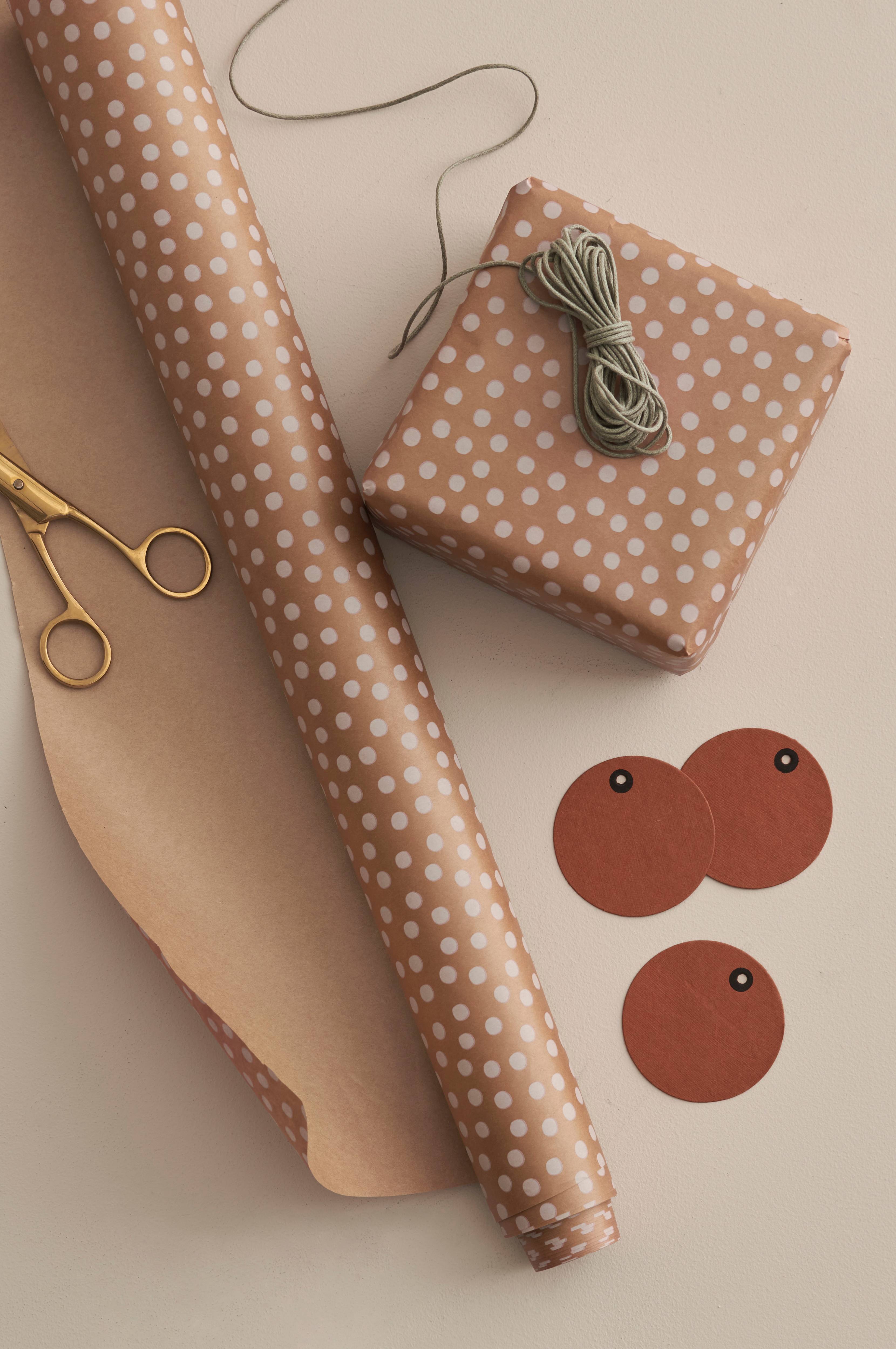 Presentpapper med tryckt prickmönster. Av matt brunpapper 80 g. Bredd 57 cm. Längd per rulle 10 meter.