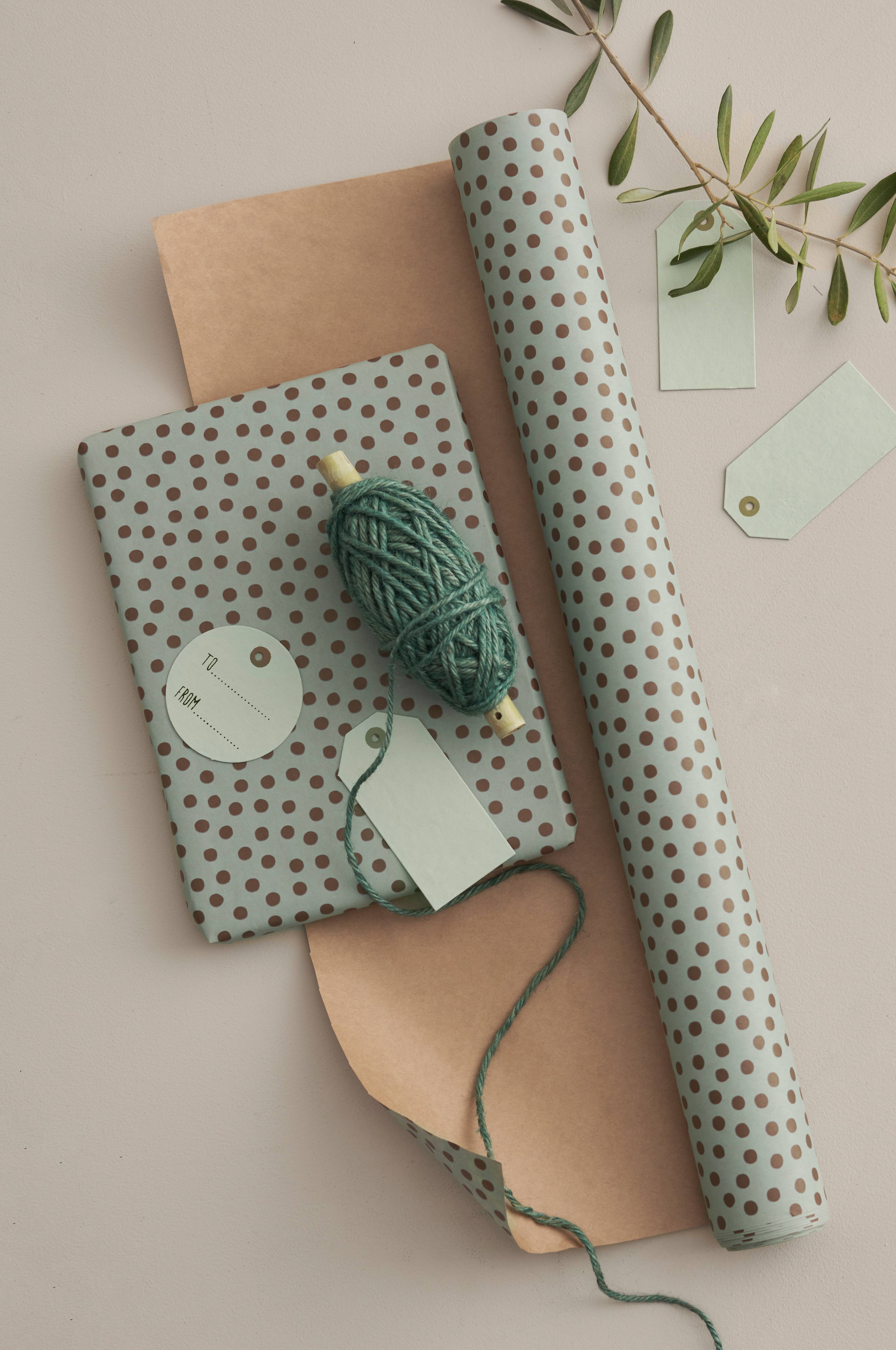 Presentpapper med tryckt prickmönster. Av matt brunpapper 80 g. Bredd 57 cm. Längd per rulle 10 meter.