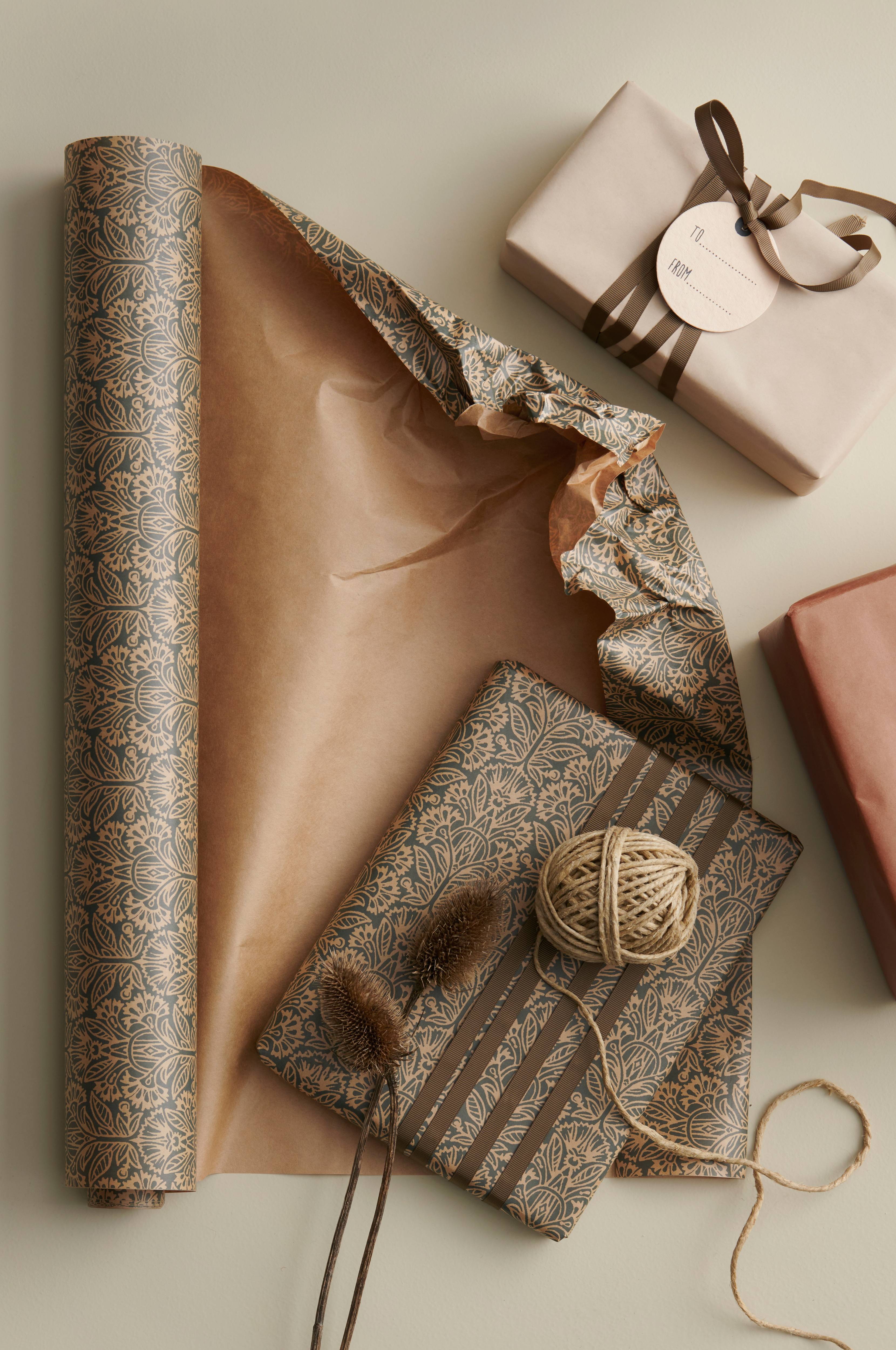 Tryckt, mönstrat matt brunpapper i kraftig kvalitet. 80 g. Bredd 57 cm. Längd per rulle 10 meter.
