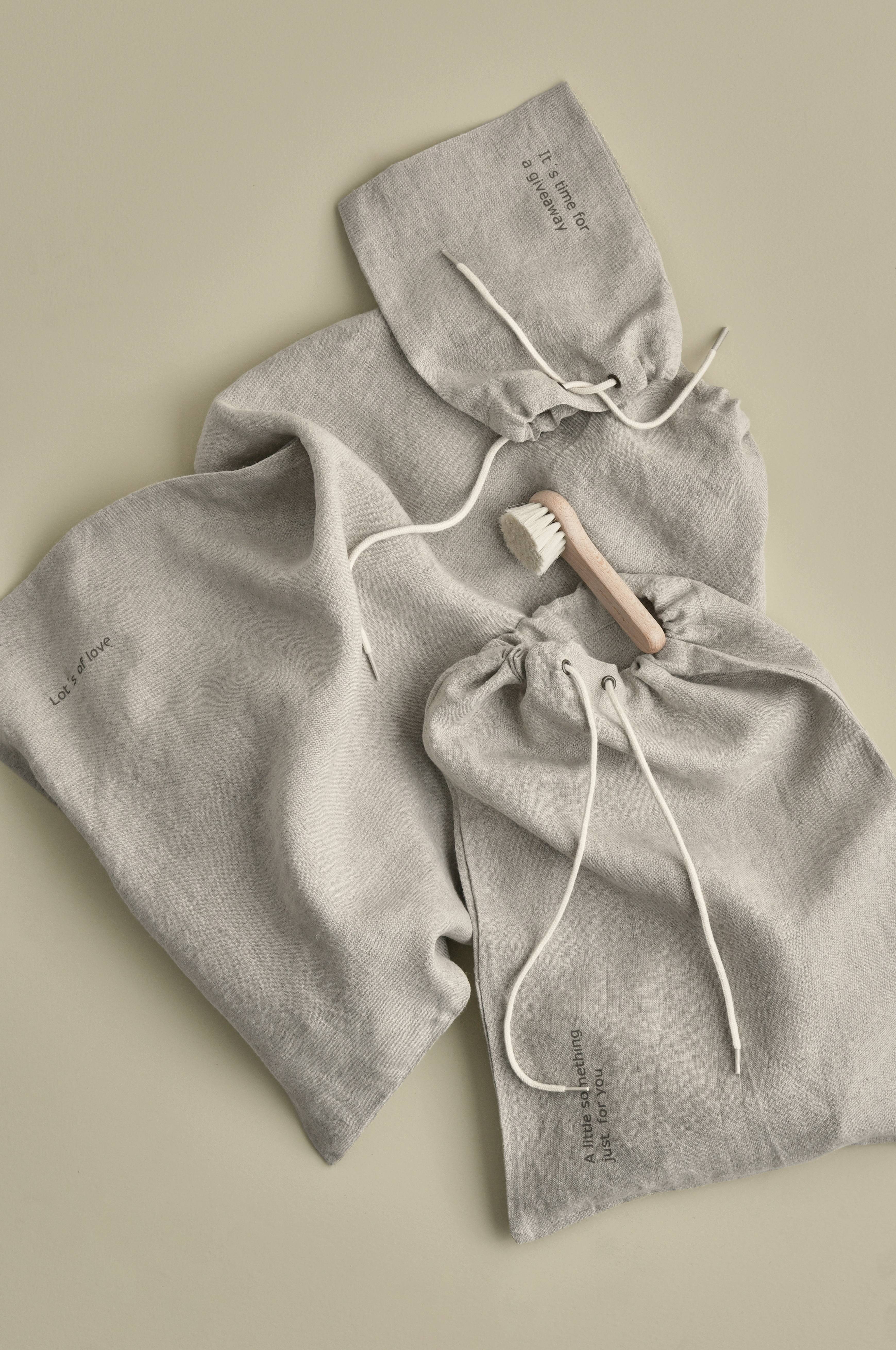 Presentpåse i linnetyg. Förslutning med dragsko som löper genom genom öljetter. Tryckt text på påsen.
