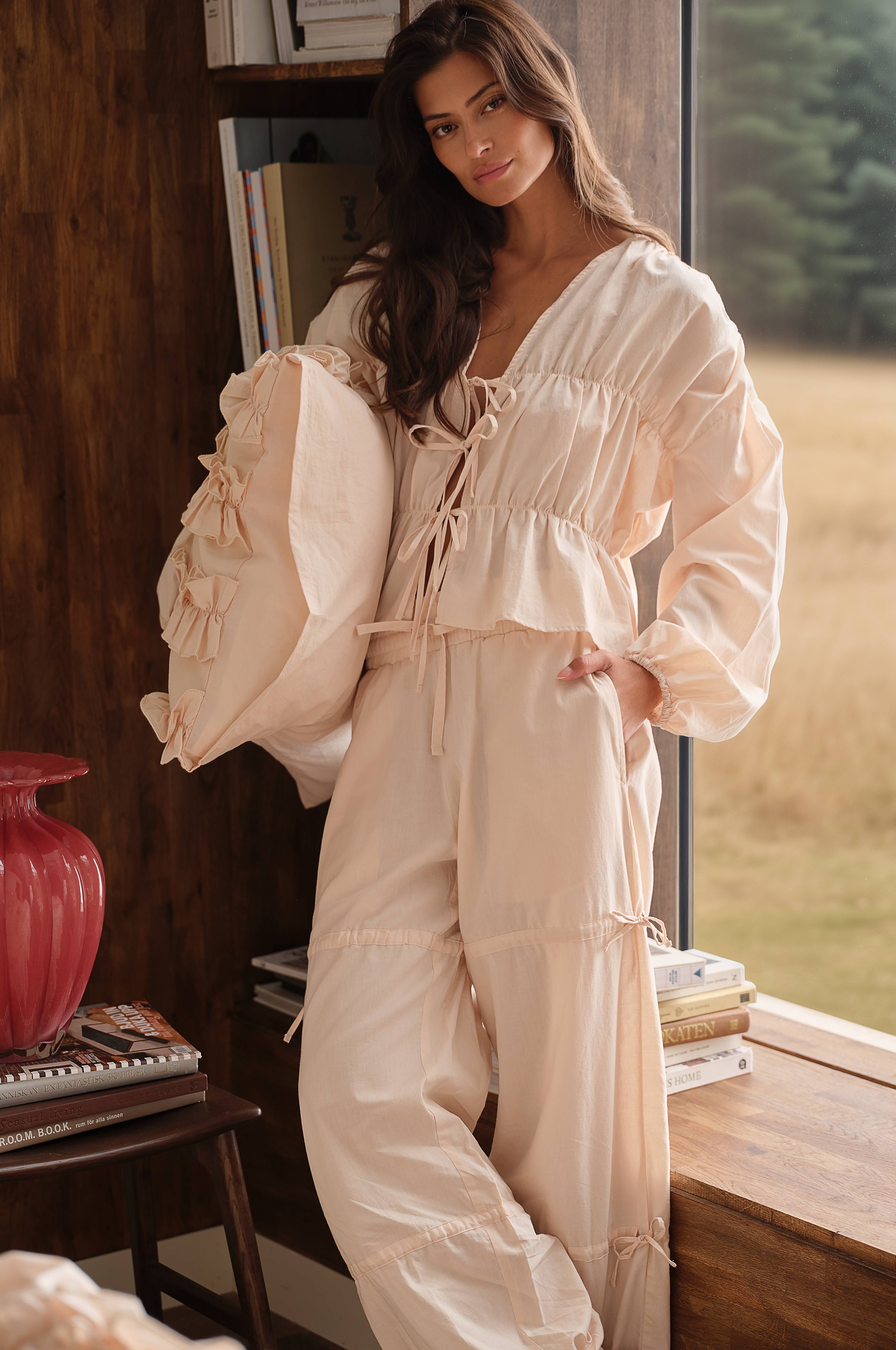 • Pyjamasbyxor i bomull med avslappnad passform• Resårmidja med dragsko och volangkant upptill• Sidfickor• Två dragskor på varje ben• Resår i bensluten