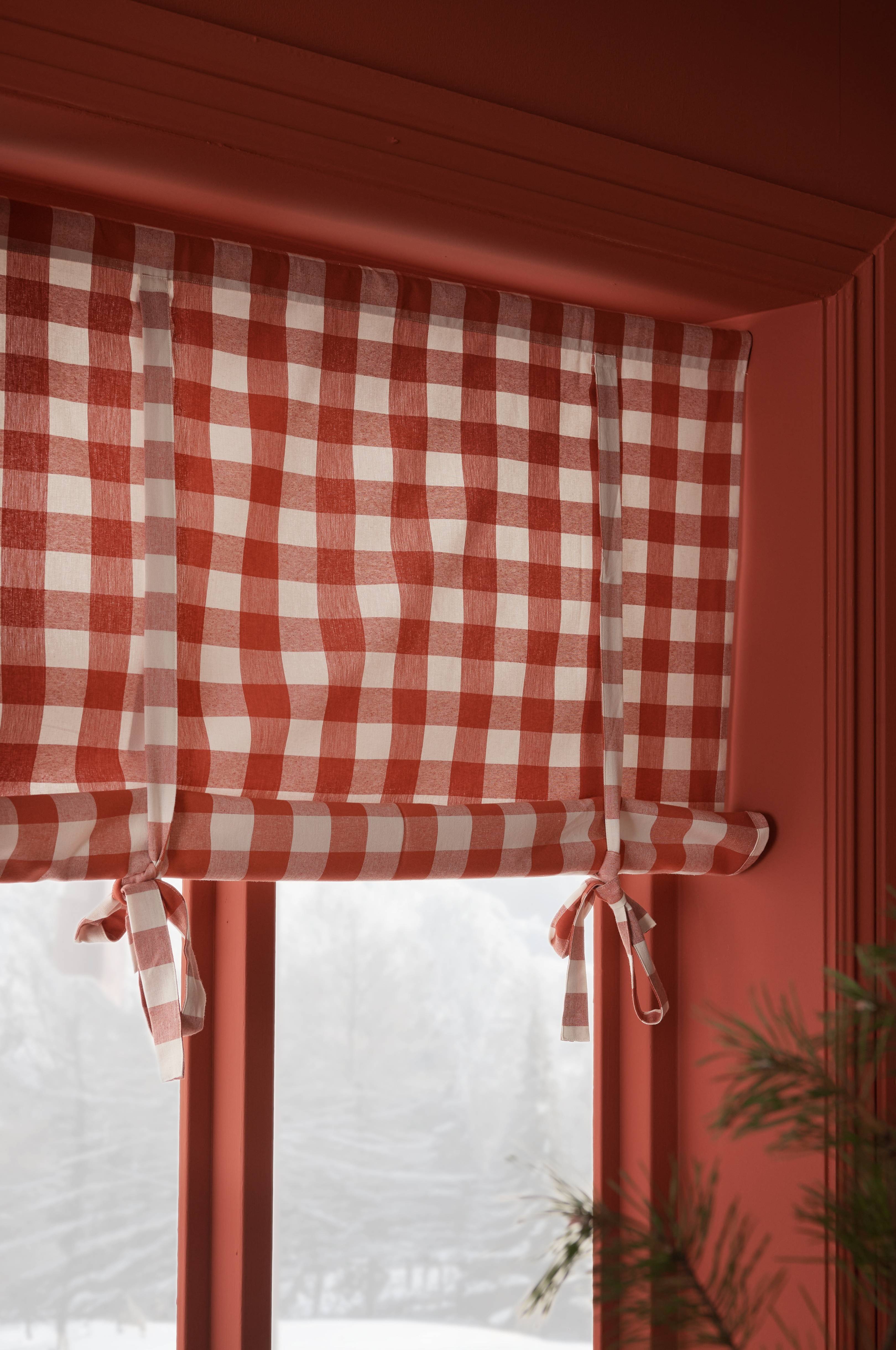 Roll up-gardin i bomull med garnfärgade rutor och knytband. För en rak nederkant, rulla gardinen runt en träpinne (träpinne ingår ej).