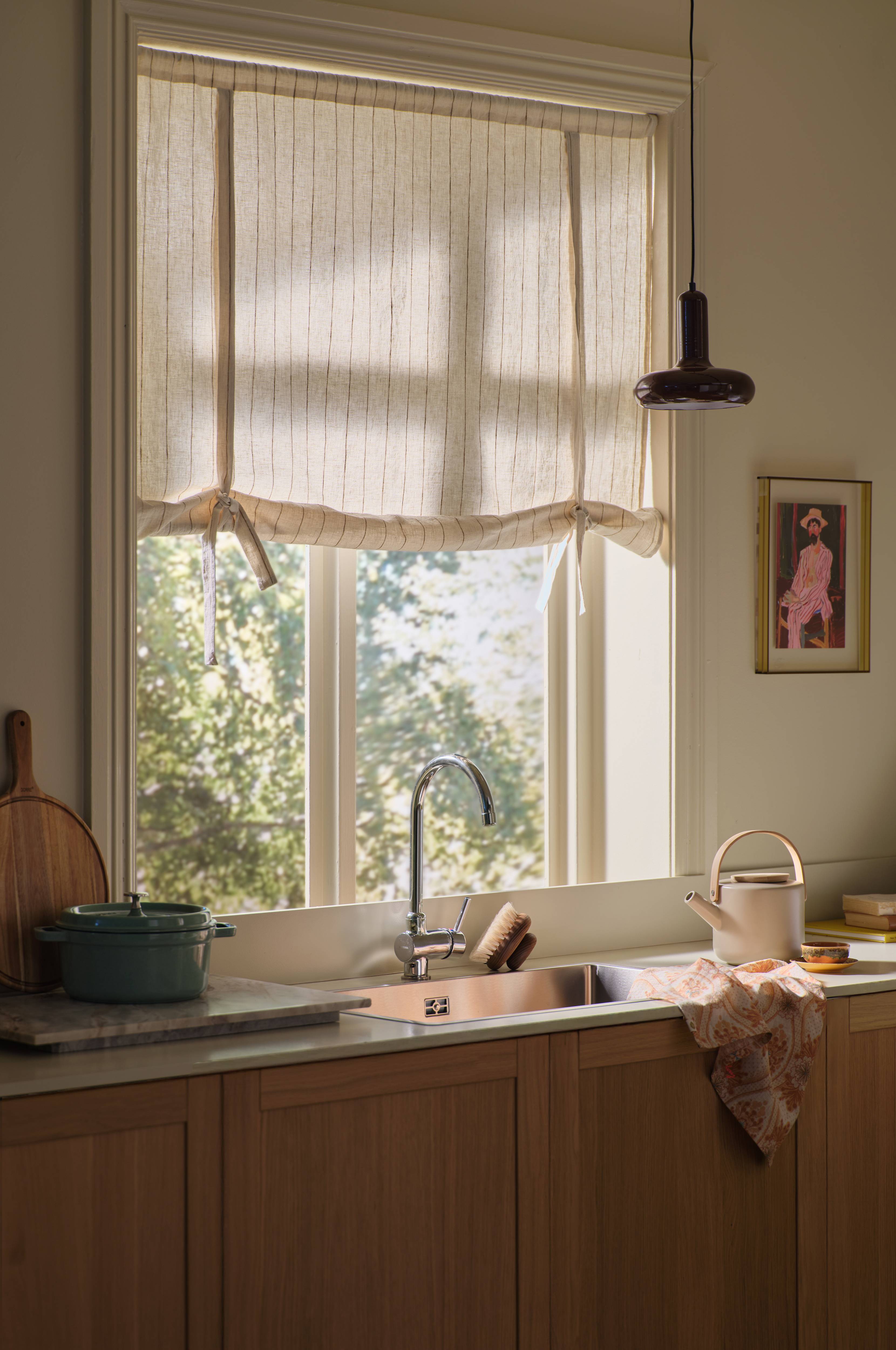 • För en rak nederkant, rulla gardinen runt en träpinne (träpinne ingår ej).