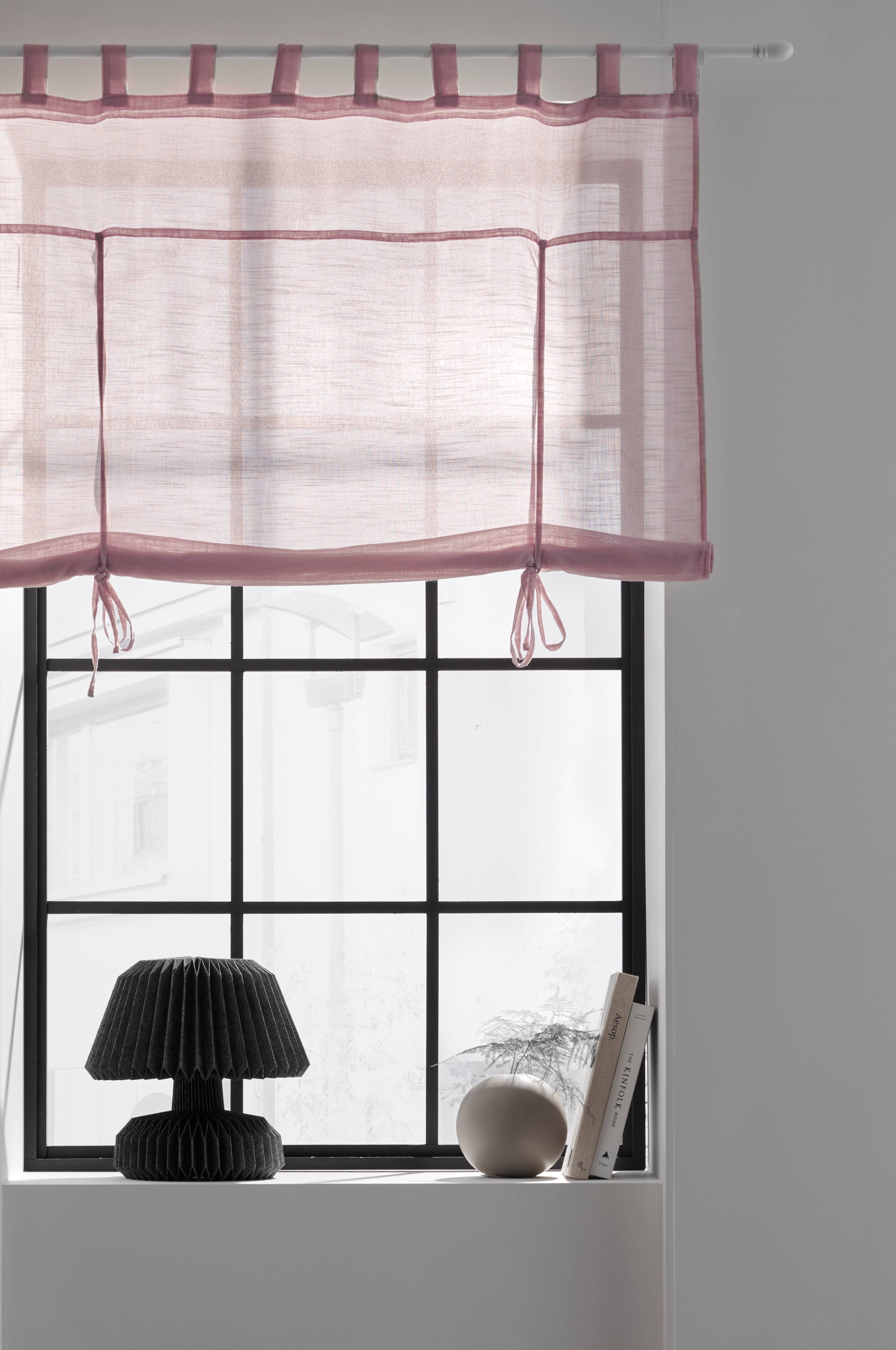 Roll up-gardin av skir polyester med struktur i linnelook. Gardinen rullas upp och fästs med knytband. Med hällor som träs på gardinstång. Använd gärna en rundstav nedtill (ingår ej).