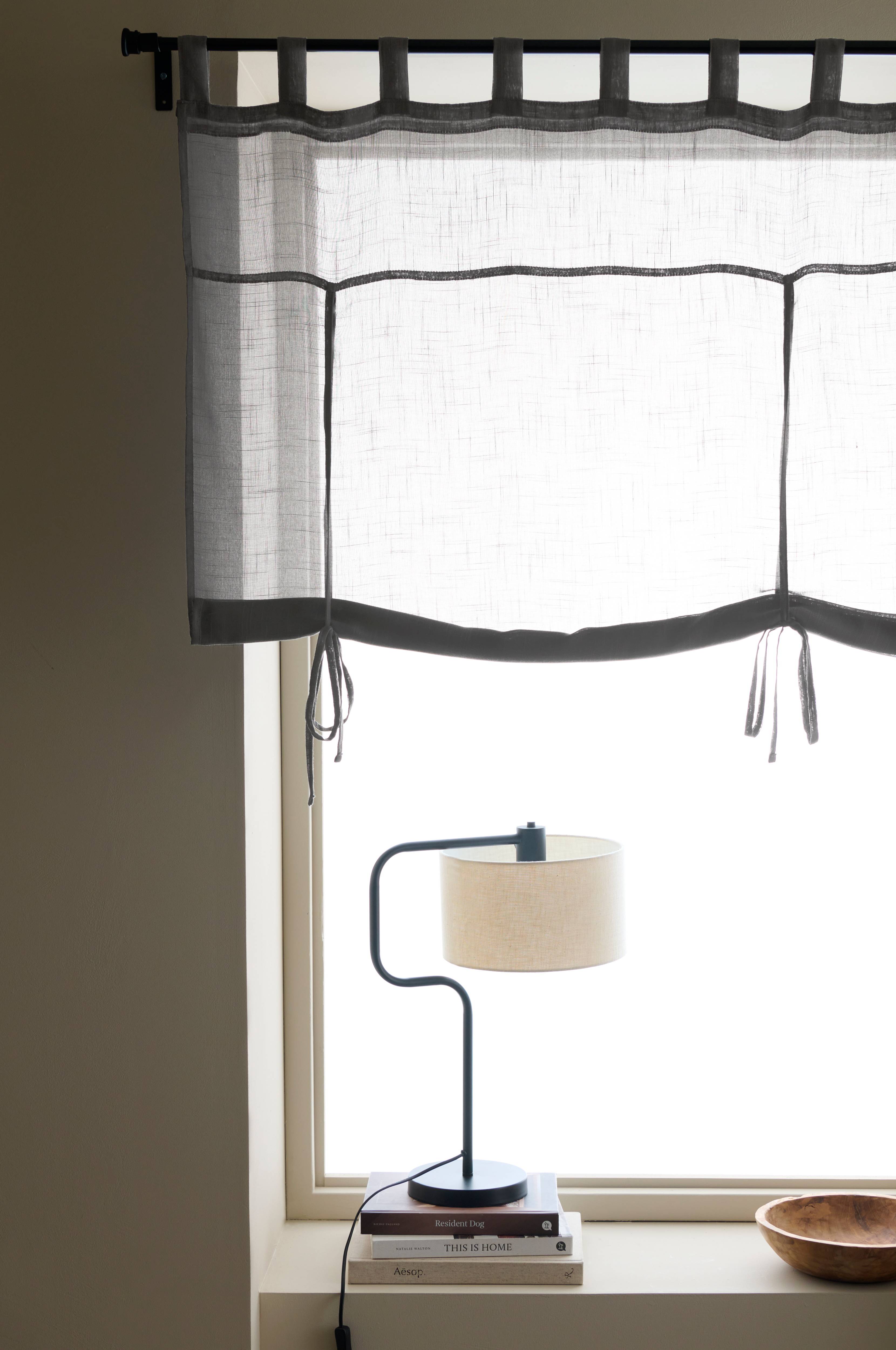 Jag har ett brett fönster och har köpt 140 cm gardinen. För ett snyggare fall hade den behövt ett tredje knytband. I övrigt en snygg gardin. Enkel men prisvärd.