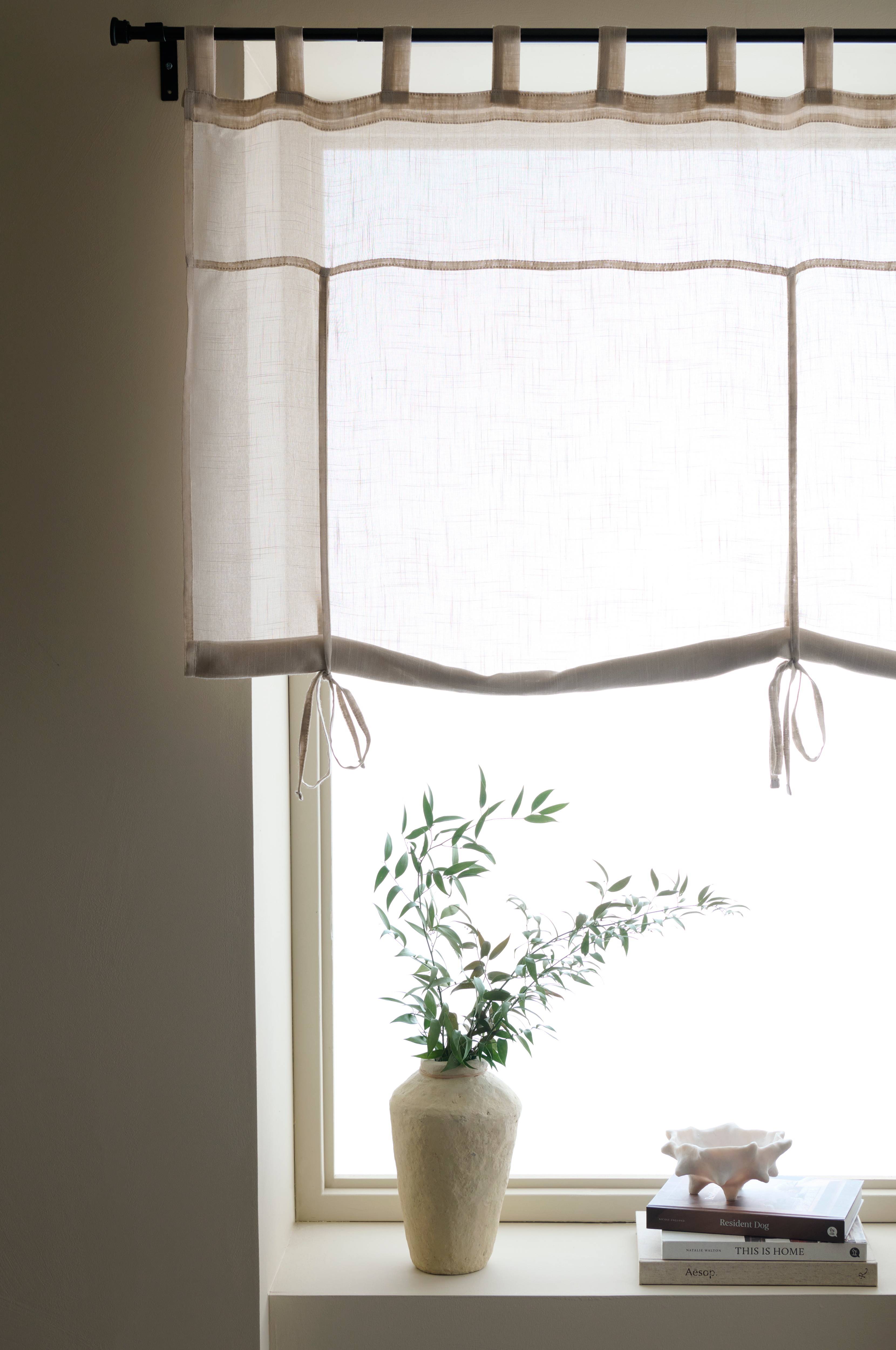 Jag har ett brett fönster och har köpt 140 cm gardinen. För ett snyggare fall hade den behövt ett tredje knytband. I övrigt en snygg gardin. Enkel men prisvärd.