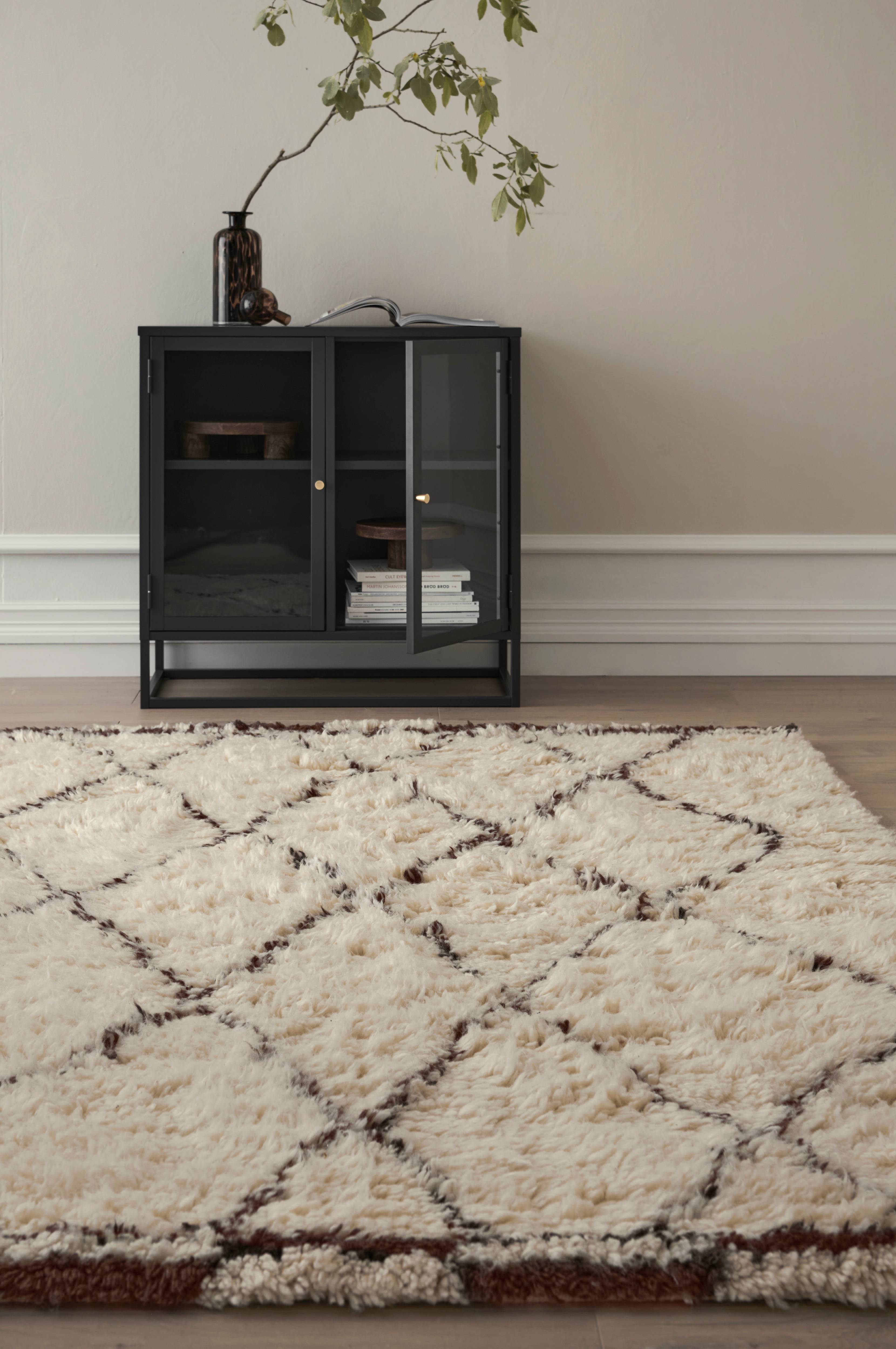 Handvävd ryamatta i mjuk ull med lång lugg och ett mönster som inspirerats av traditionella marockanska mattor. Tjocklek ca 4 cm. Luggens längd 5 cm.