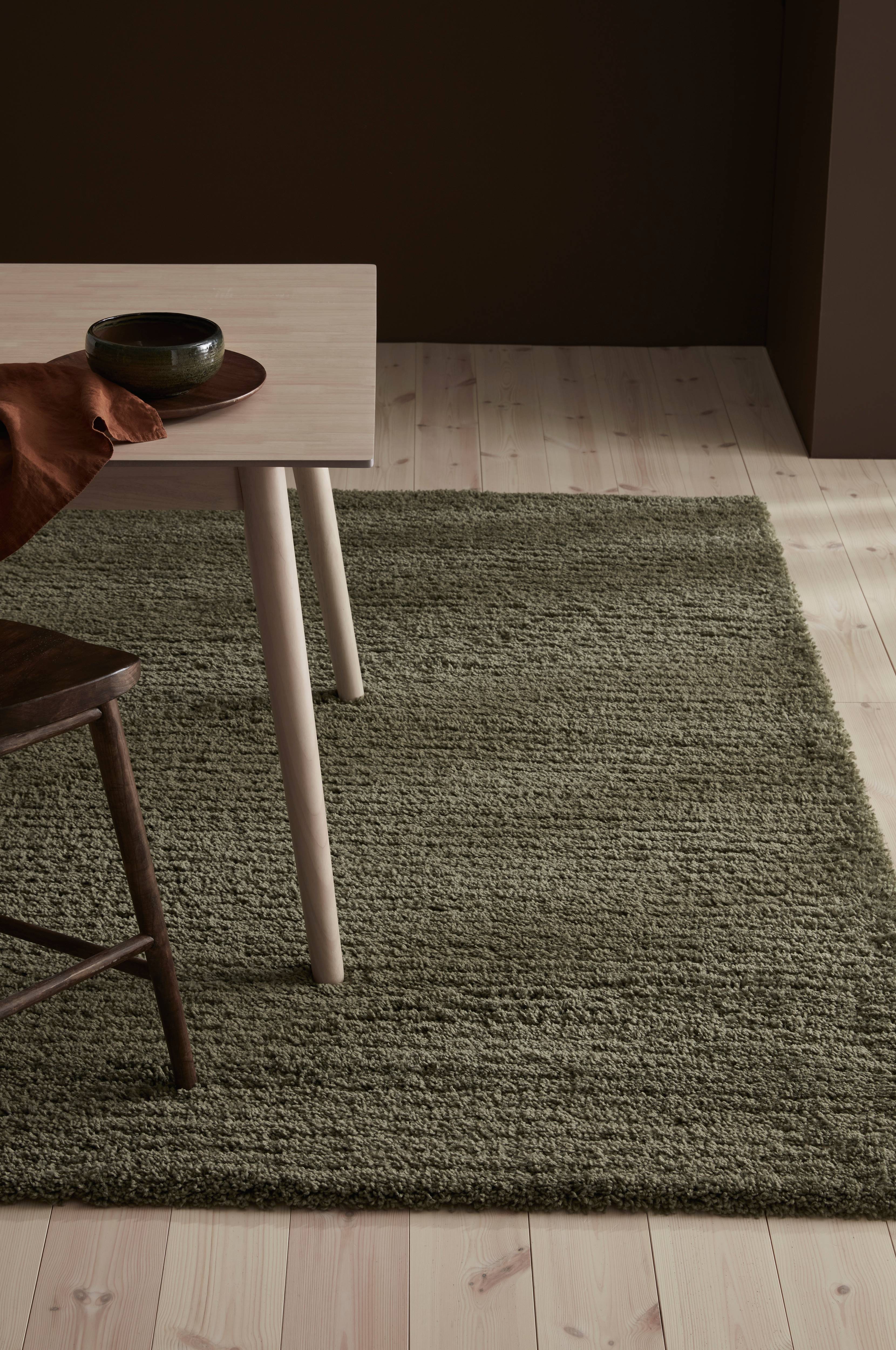 Tuftad ryamatta med tät, tjock och mjuk lugg. Randig struktur. Lugghöjd ca 2 cm.