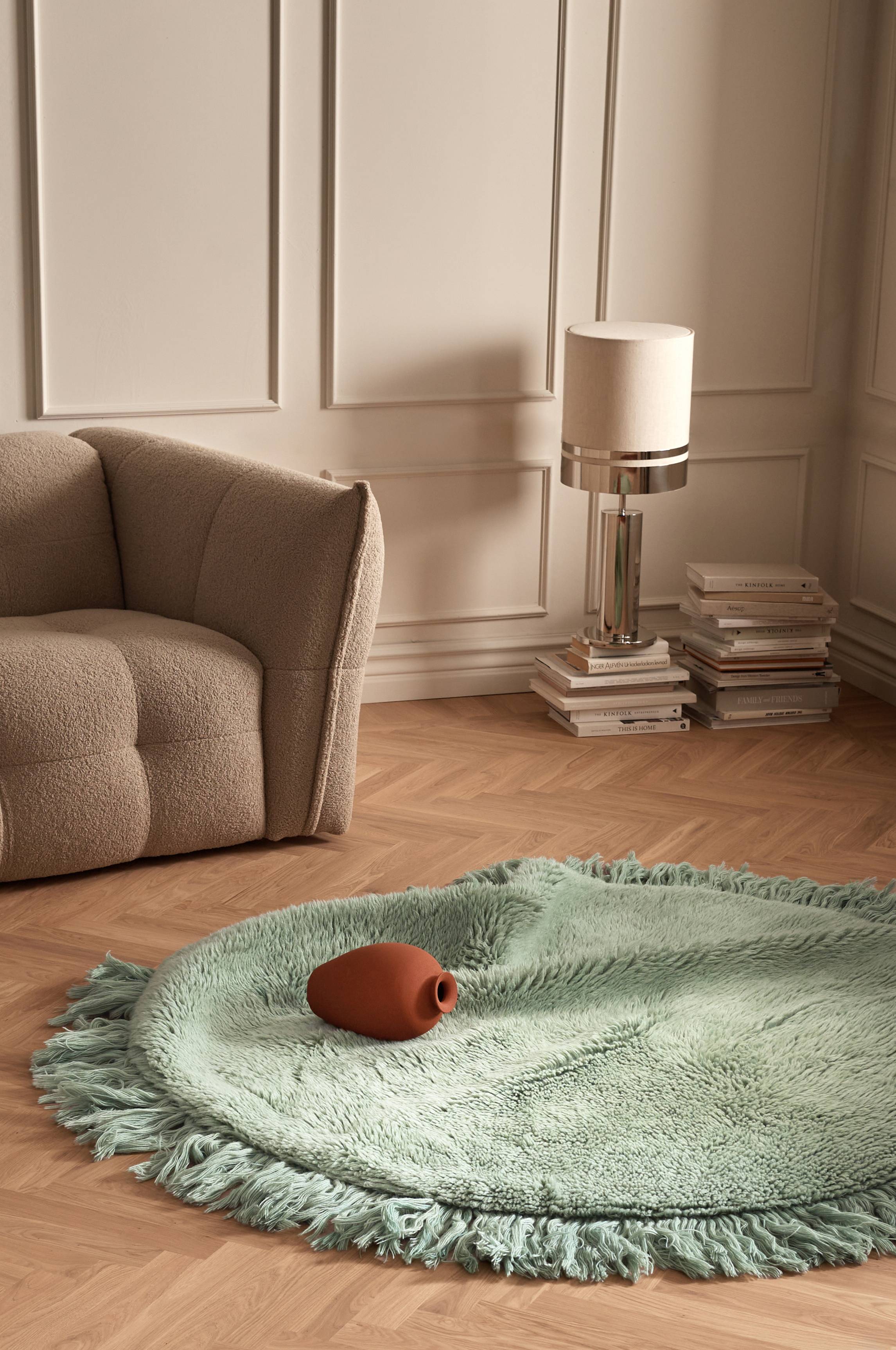 Handtuftad, rund ryamatta i ull av hög kvalitet. Knutna fransar runt om. Fransarnas längd 20 cm. Mattans tjocklek 2 cm.