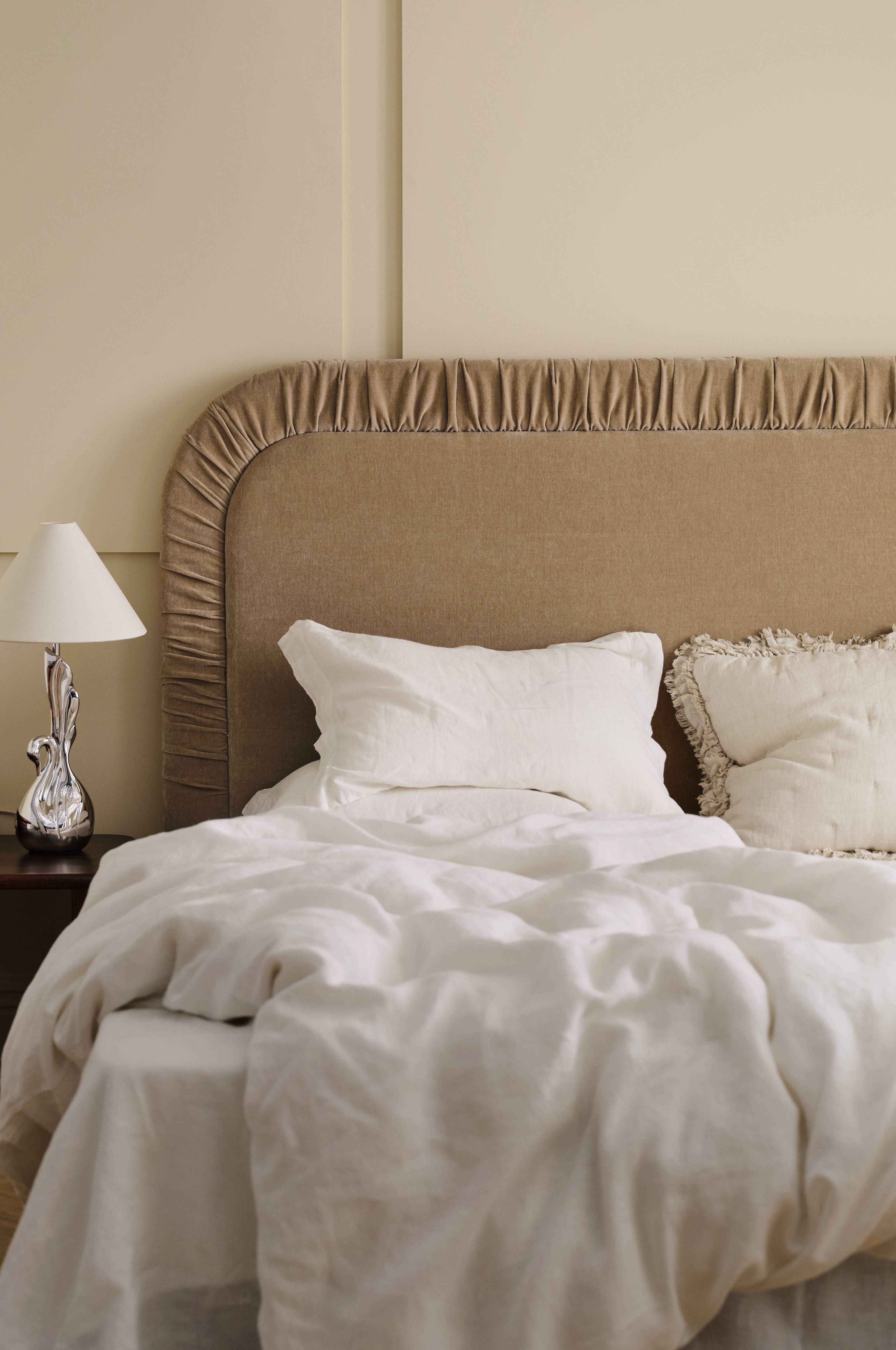 • Sänggavel med klädsel i chenille• Dekorativ söm runt om• Rynkad effekt längs kanten• Stomme i massivt trä och plywood• Skumfyllning• Väggupphängning