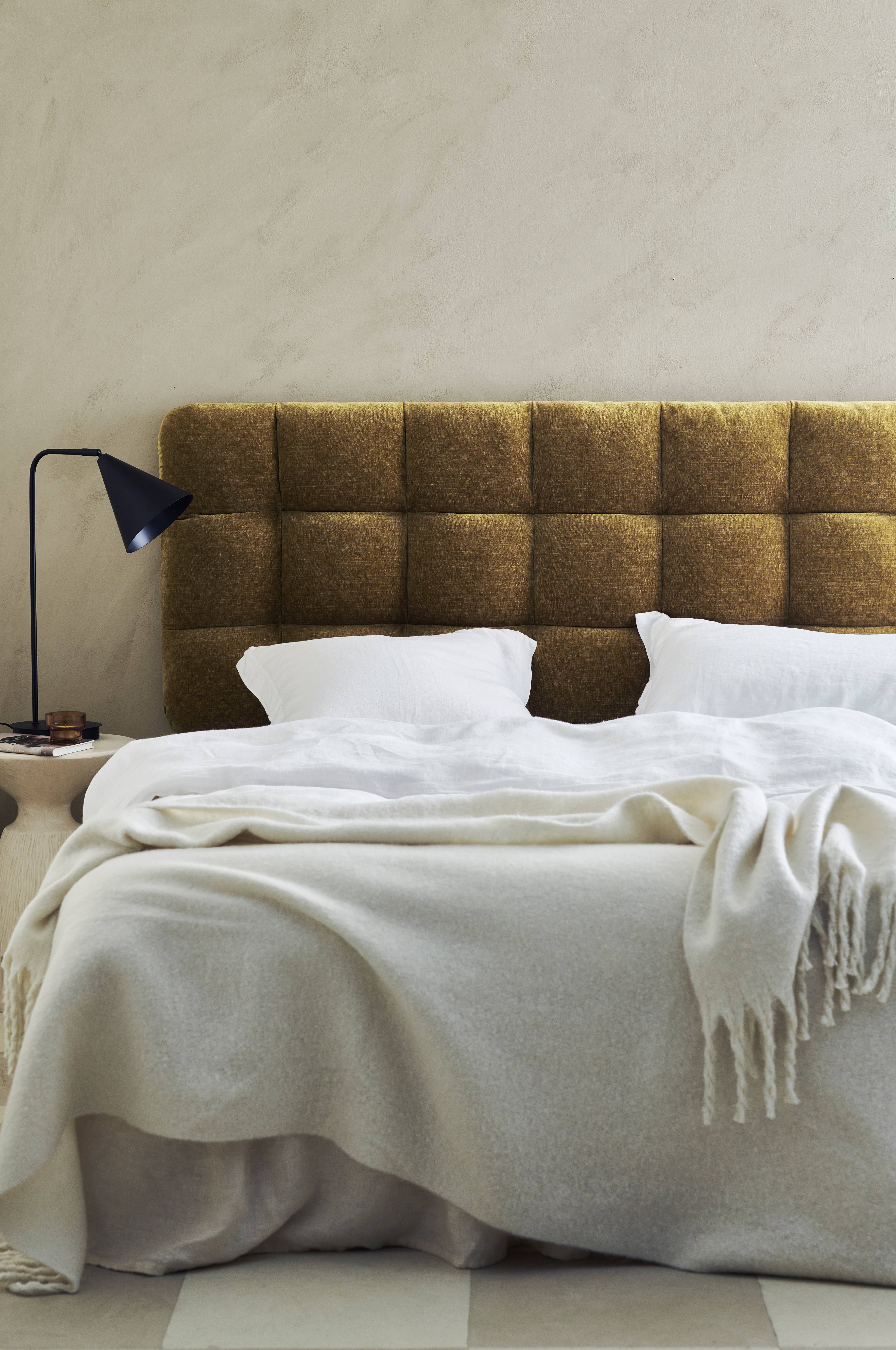 Vadderad sänggavel med ram i massivt trä och plywood. Klädsel i tvättad sammet av polyester med dekorativa sömmar som bildar ett rutmönster. Fyllning av polyestervadd. För väggupphängning.