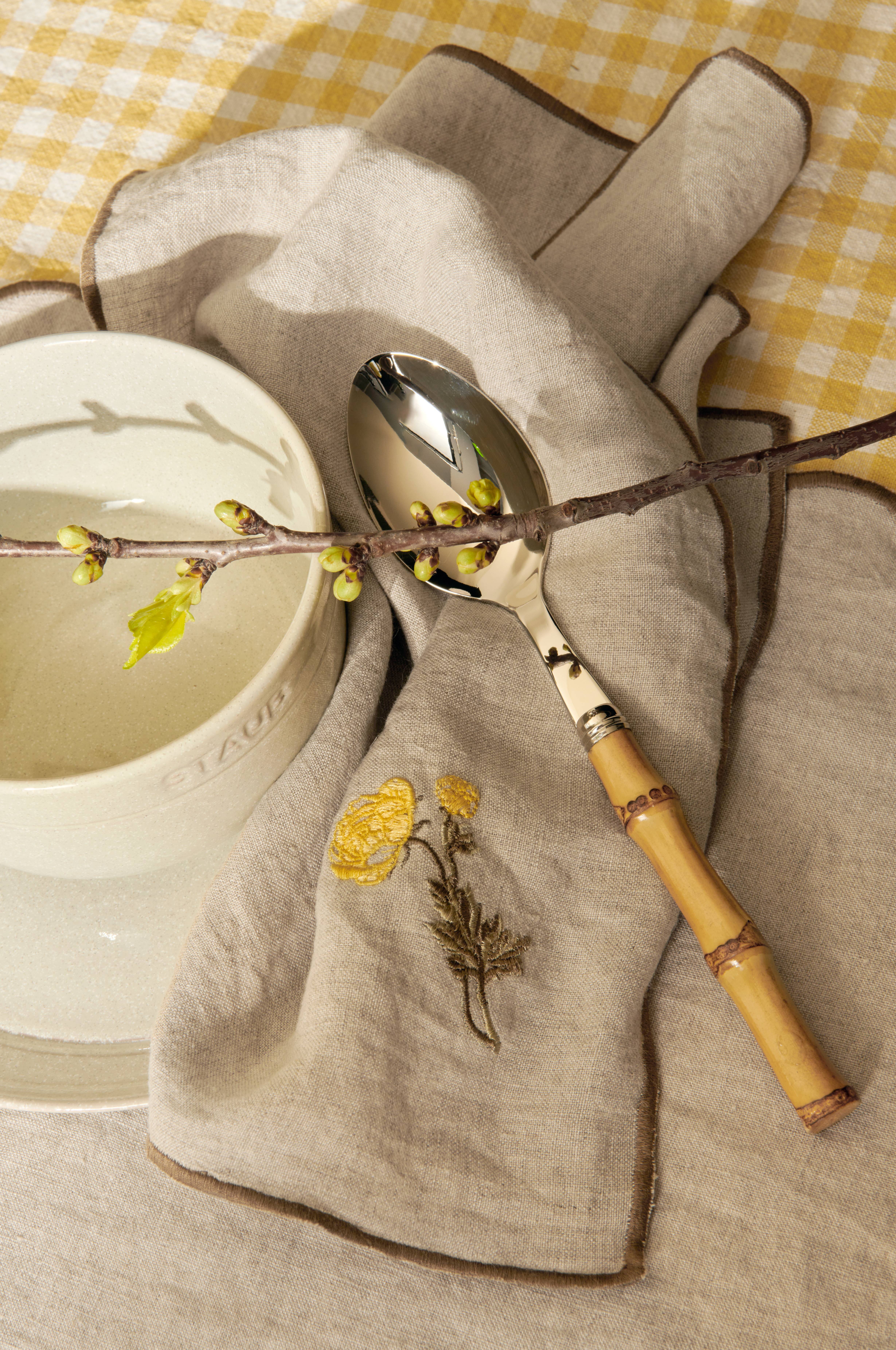 2 st servetter i tvättat lin. Kontrasterande overlocksöm runt om och en broderad blomma i ena hörnet. Stl 42x42 cm.