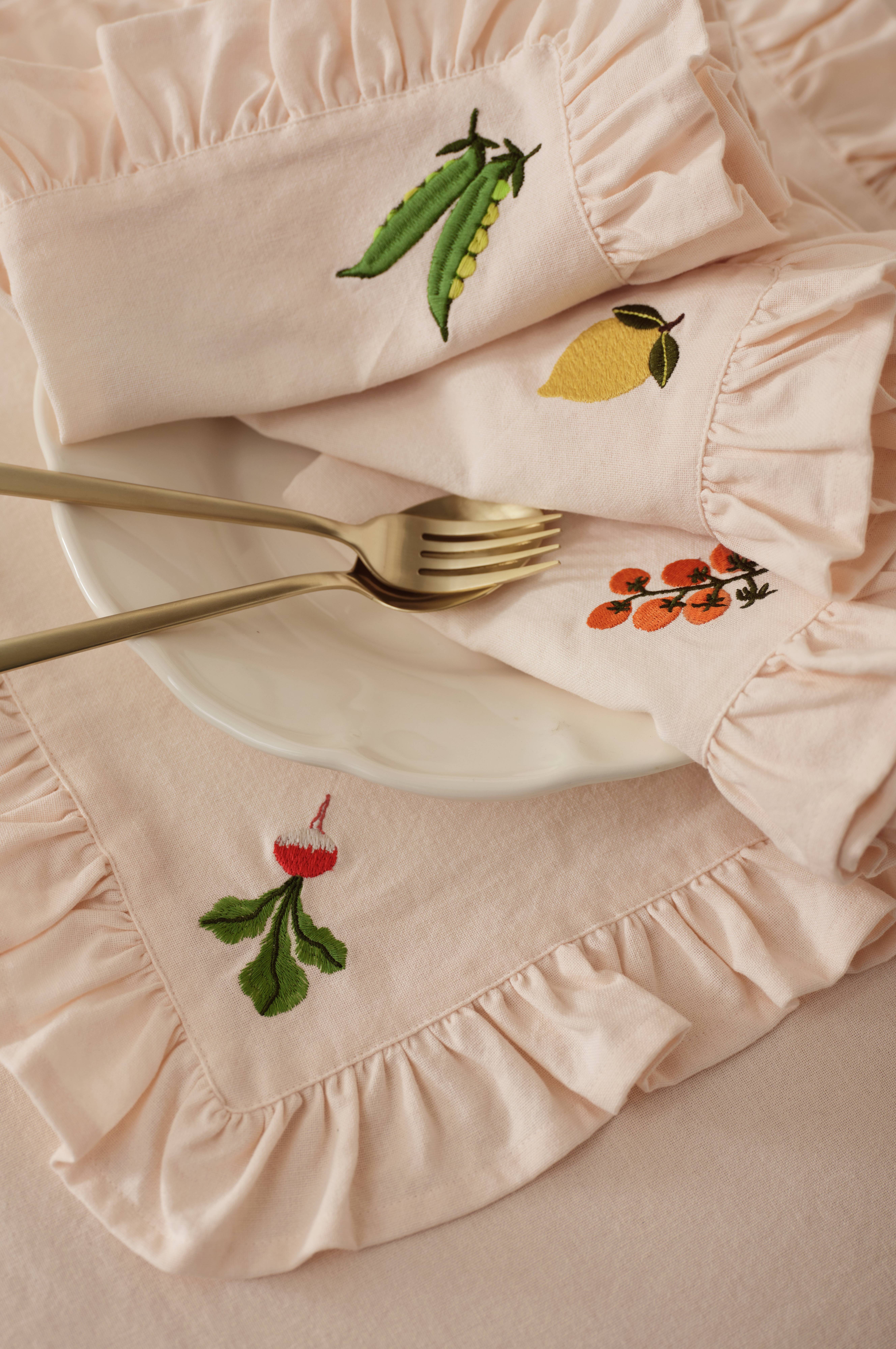 • Enfärgade servetter i bomull• Broderat motiv i överkanten• 5 cm volang runt om
