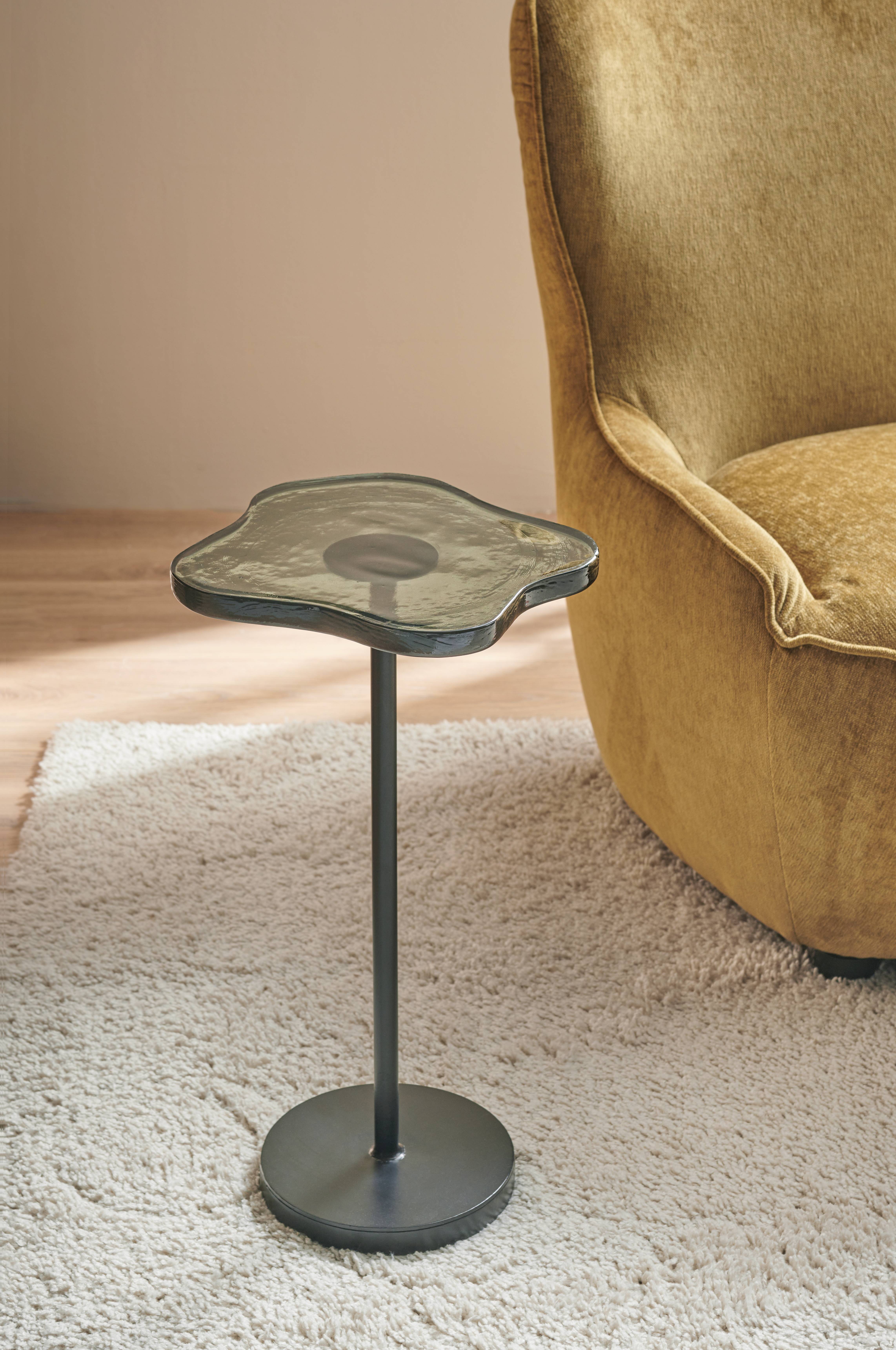 Sidobord av pulverlackad, matt metall med organisk form. Toppskiva av härdat, rökfärgat glas i kraftigt utförande.