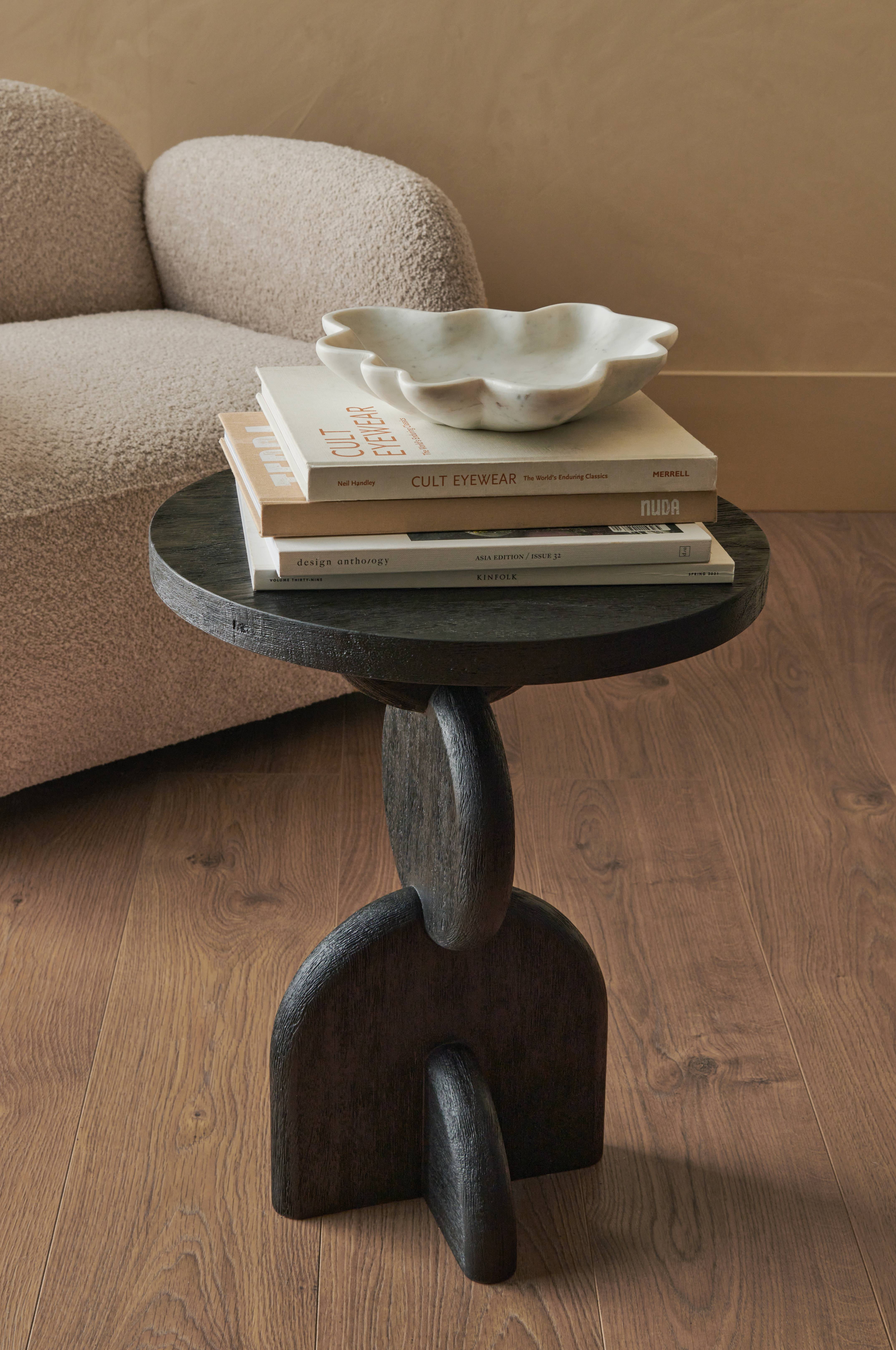 Runt sidobord i mangoträ med skulpterat ben. Toppskivan har en vaxad yta med tydlig trästruktur.