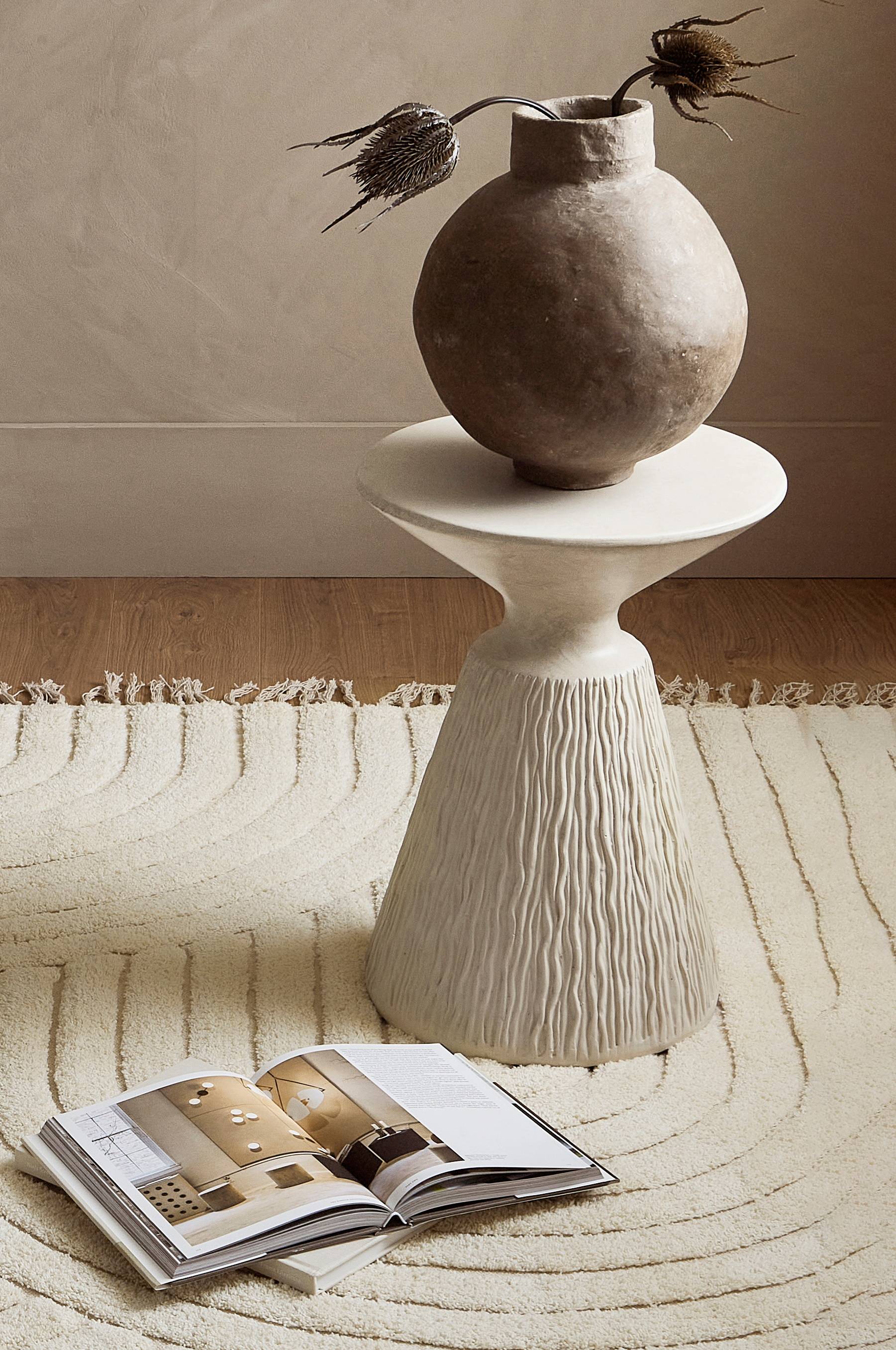 Sidobord med stomme i metall och en belagd, tålig yta av MgO, som är en betongfiber. Bordet kan stå utomhus i ur och skur men plocka in det när frosten kommer.