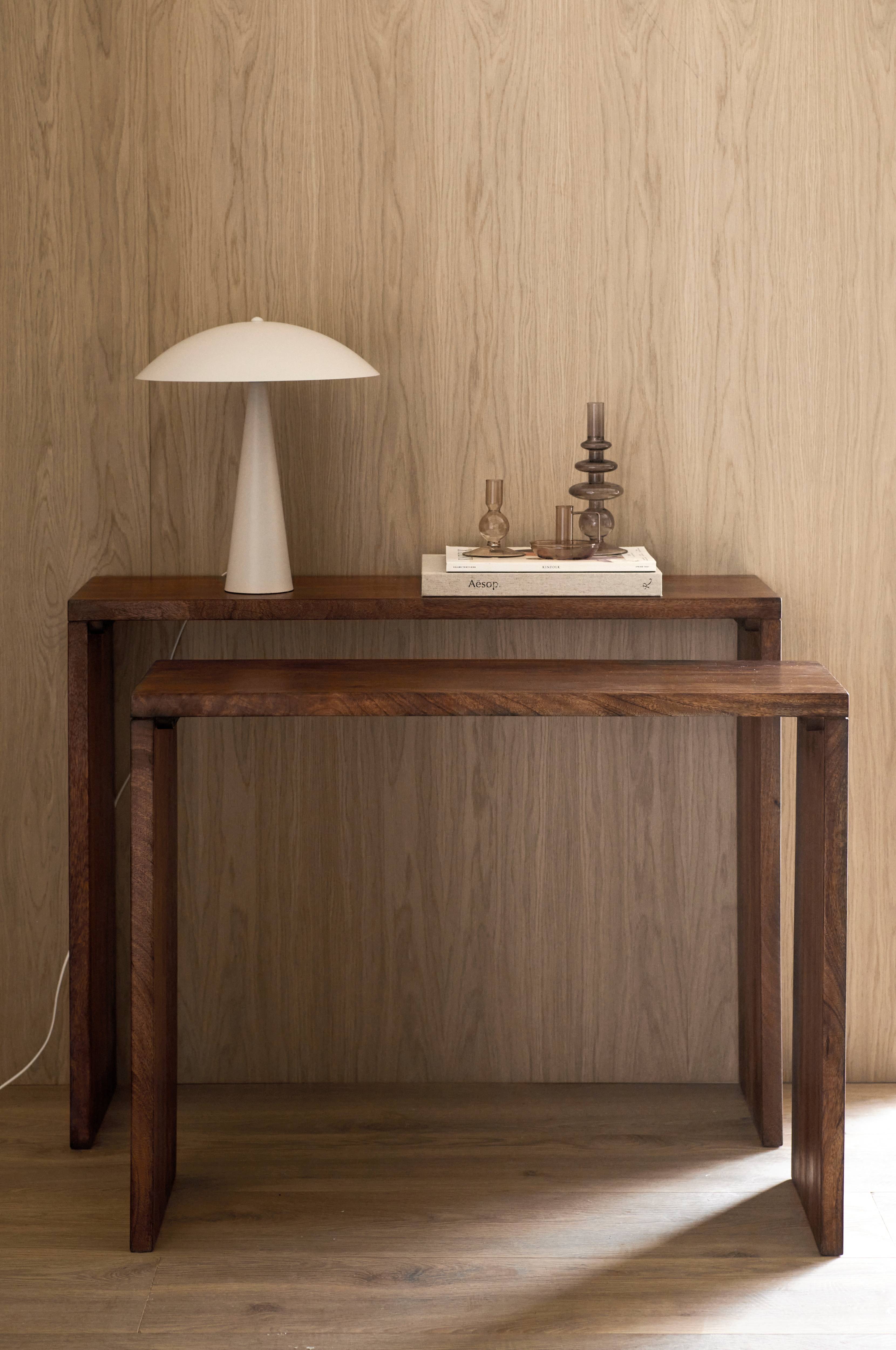 2 st sidobord / skrivbord i olika storlekar. Kan användas separat eller tillsammans. Av massivt mangoträ med vaxad finish. Lev. monterade.
