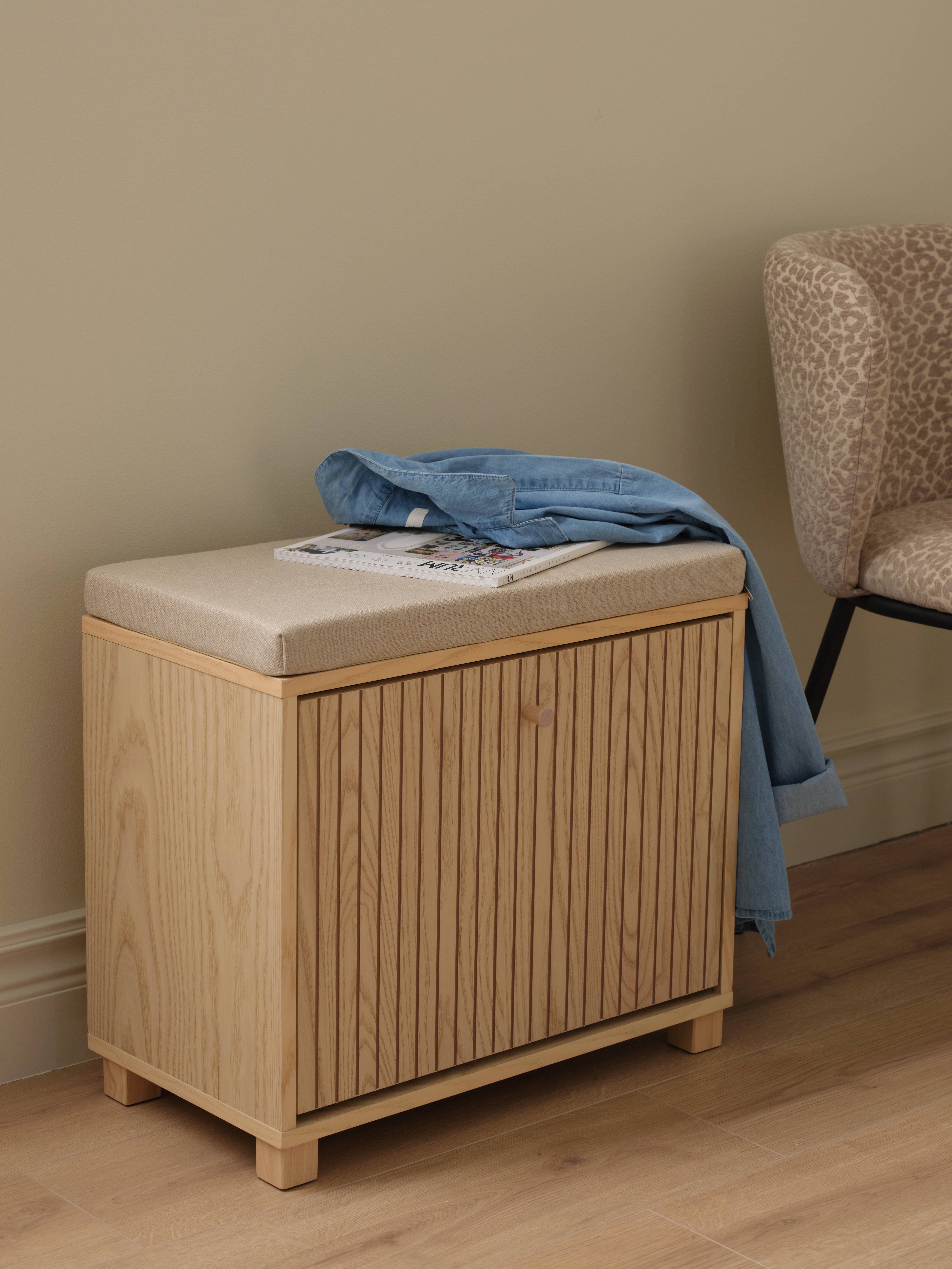 • Sittbänk med vadderad sits• Gjord av askfanérad MDF med ribbad struktur på framsidan• Utdragbar hylla med två fack• Ben i ask• Frihöjd under möbeln: 4 cm