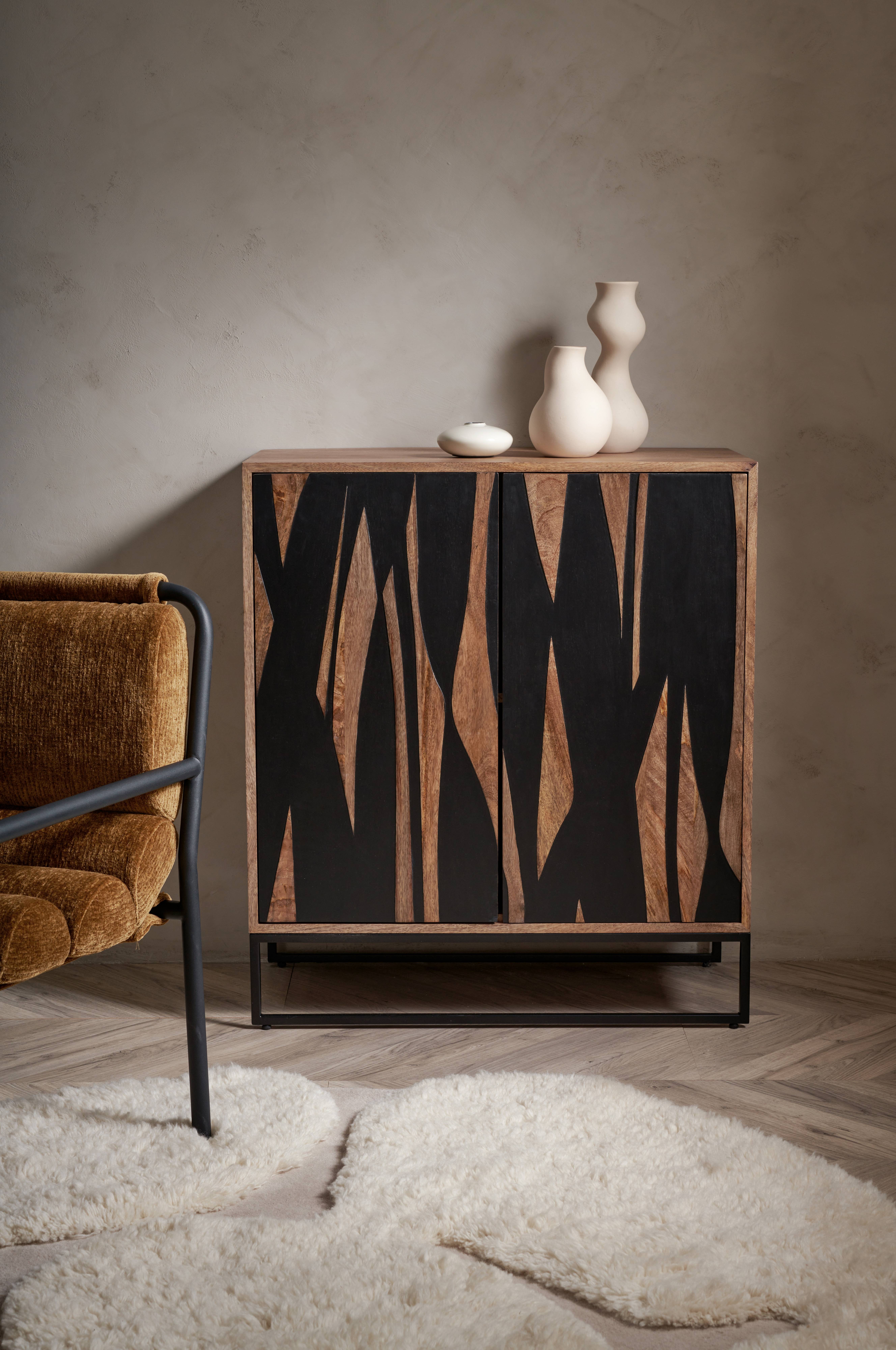 Skåp i massivt mangoträ. 2 luckor med pushfunktion och dekorativt, urfräst och målat mönster. 1 fast hyllplan i skåpet. Höjd mellan hyllplanen 35 cm. Ben av pulverlackad metall. Frihöjd under möbel 14 cm.