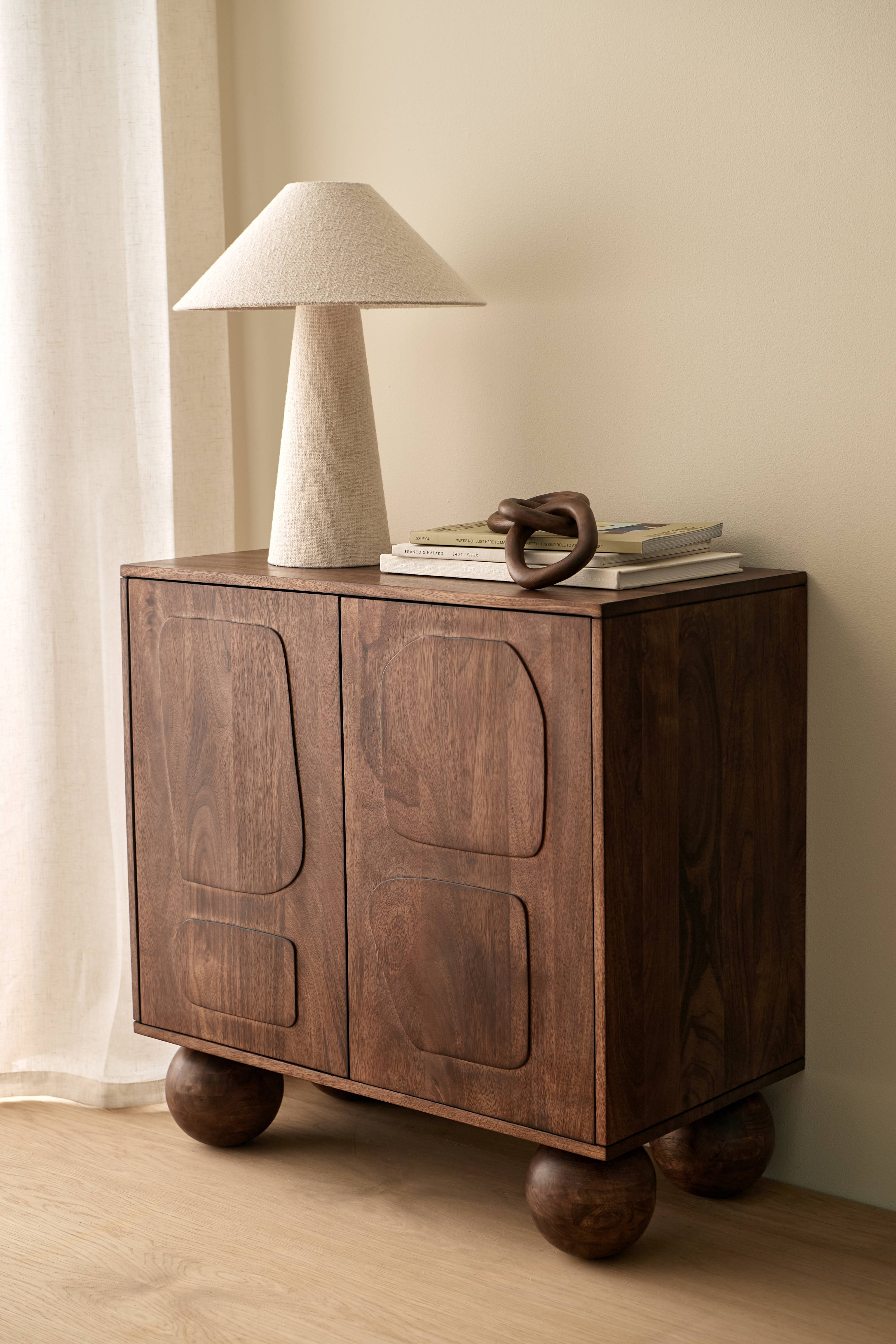 • Skåp i mangoträ med vaxad finish • Två skåp • Två dörrar med push-funktion och ett oregelbundet, dekorativt strukturmönster • Ett fast hyllplan i varje skåp • Avstånd mellan hyllplanen: 28 cm • Frihöjd under möbeln: 15 cm • Produkten innehåller FSC-certifierat trä, avverkat från ett ansvarsfullt skogsbruk som tar hänsyn till människor och miljö.