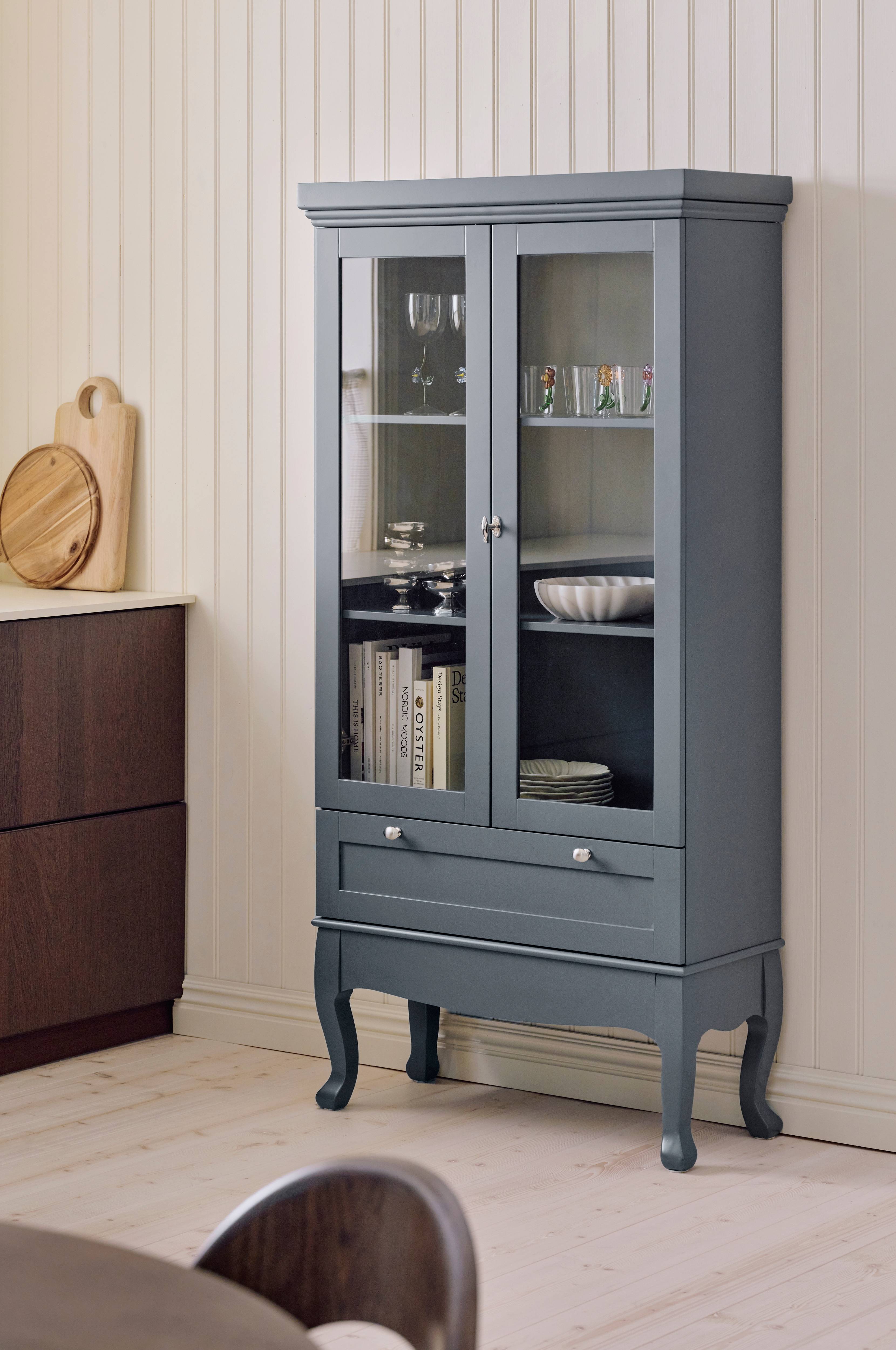 • Skåp med dörrar i MDF och härdat glas• Klassiskt vridlås på dörrarna• Två fasta hyllplan• En utdragbar låda med två knoppar• Ben i MDF• Blandar modern design med mer klassiska inslag