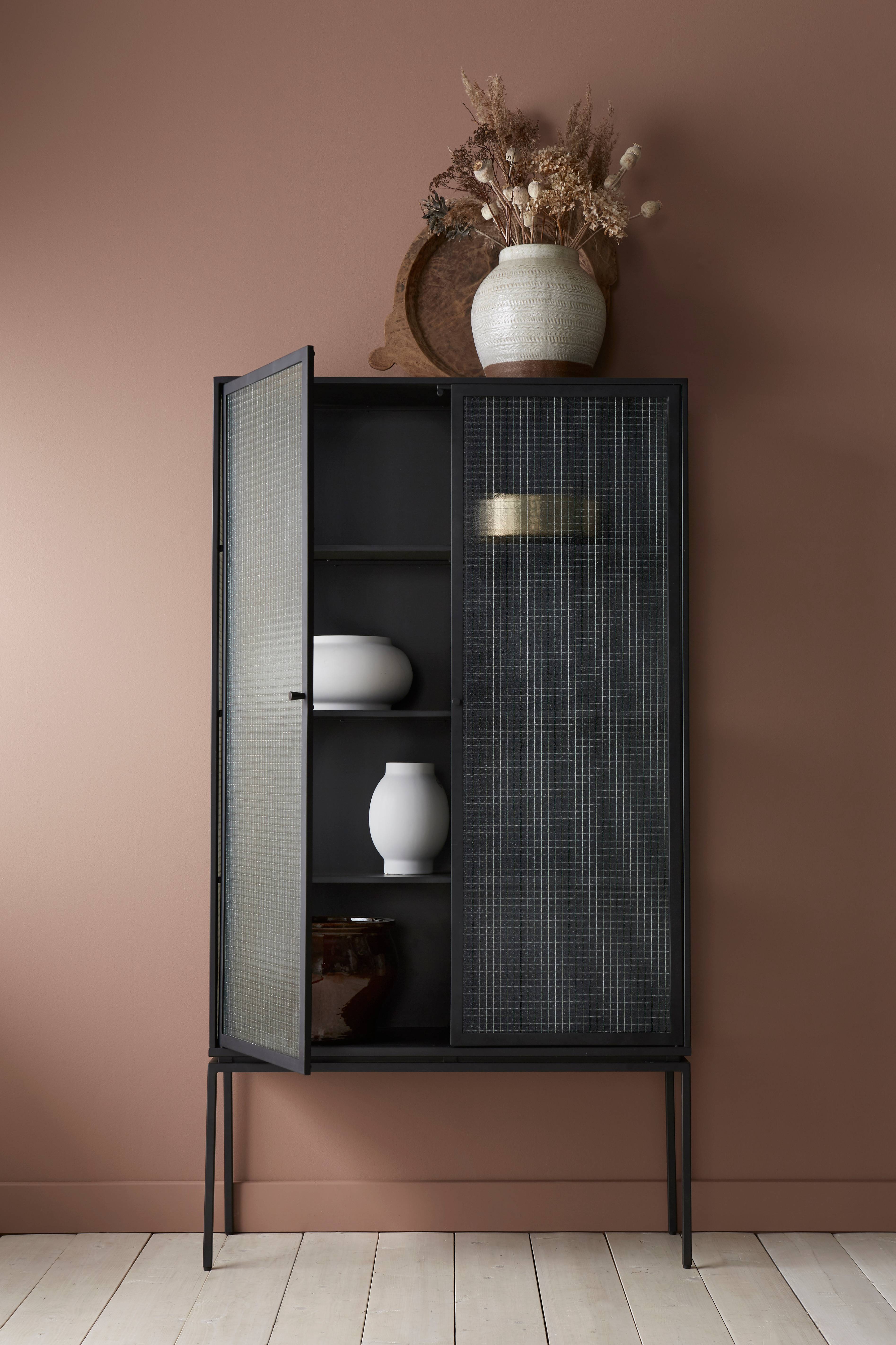 Skåp med stomme av matt pulverlackat järn och sidor och dörrar i trådglas. Baksida av plåt. 2 dörrar. Skåpet har 3 fasta hyllplan, max vikt per hyllplan 15 kg.