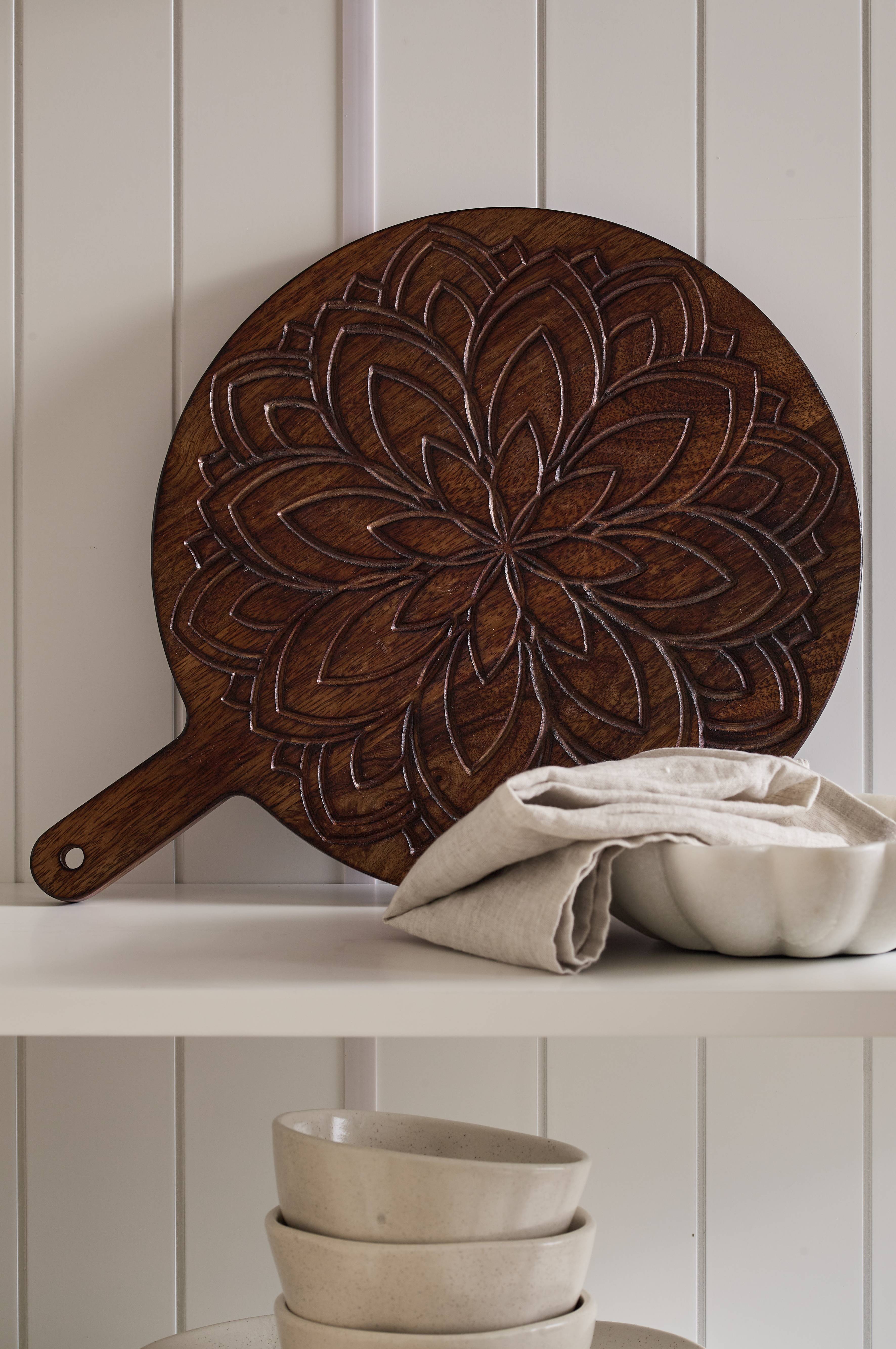 Skärbräda av mangoträ med vaxad finish. Utskuret mönster på framsidan. Handtag med hål för upphängning. Handtagets längd 10 cm.
