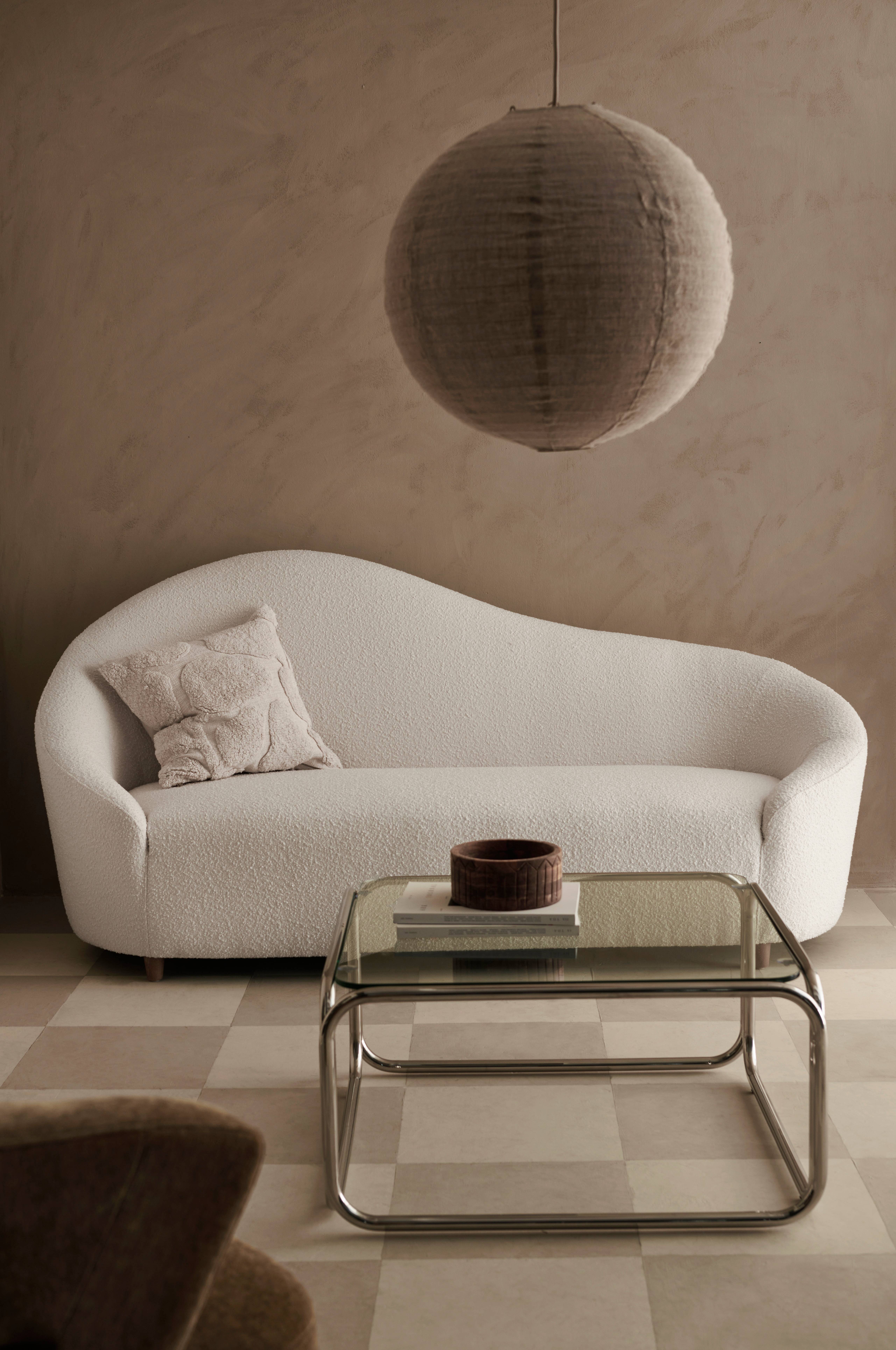 Soffa med klädsel i bouclé av polyester och akryl. Rygg med mjuk, organisk form.