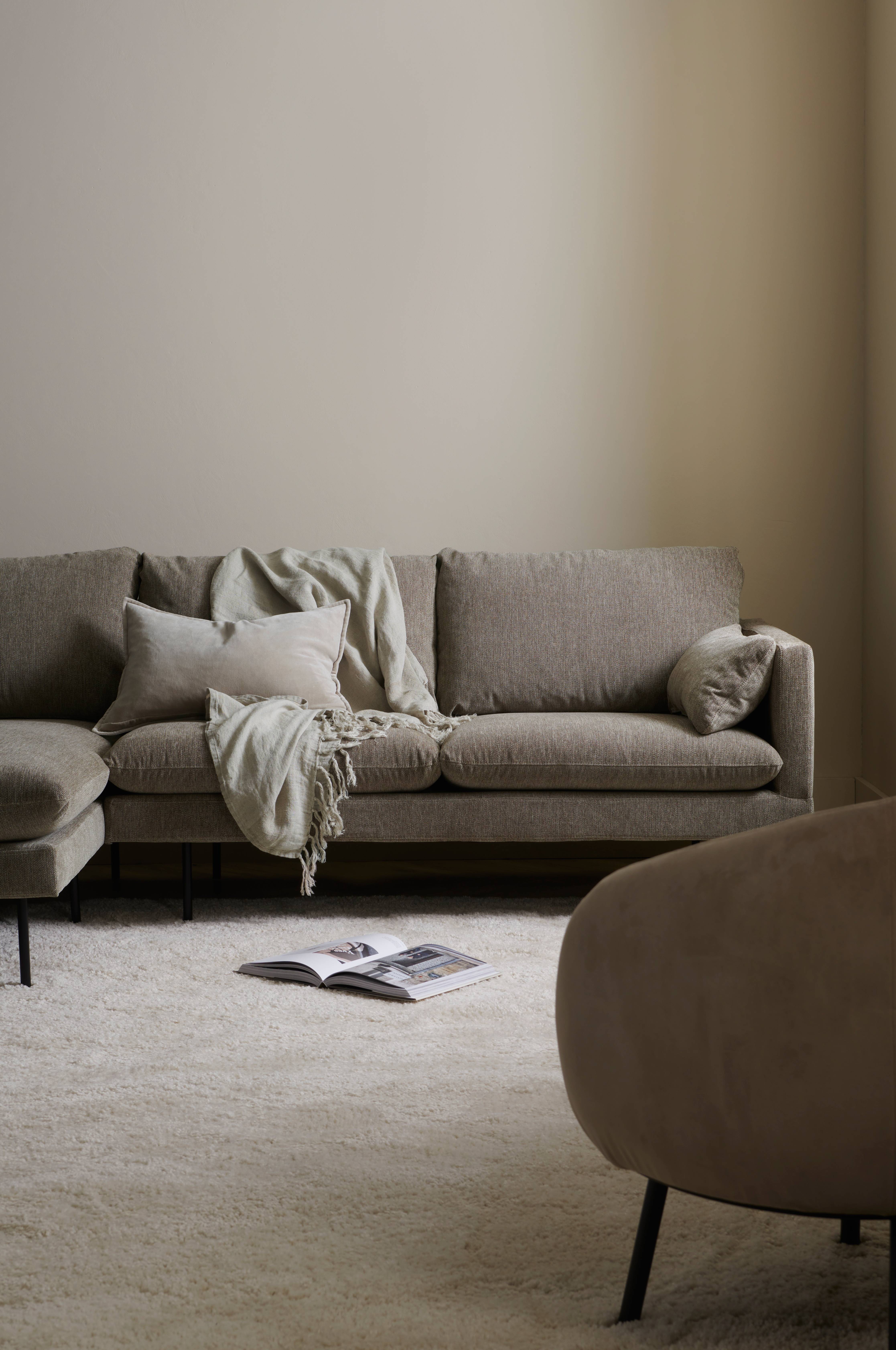 3-sitsig soffa med vänsterställd schäslong. Stomme av furu. Fyllning av polyeterskum med vävband och "no-zag"-fjädring. Klädsel i 100% polyester. Ben av metall. Sittdjup schäslong 118 cm. Frihöjd under möbel 21 cm,
