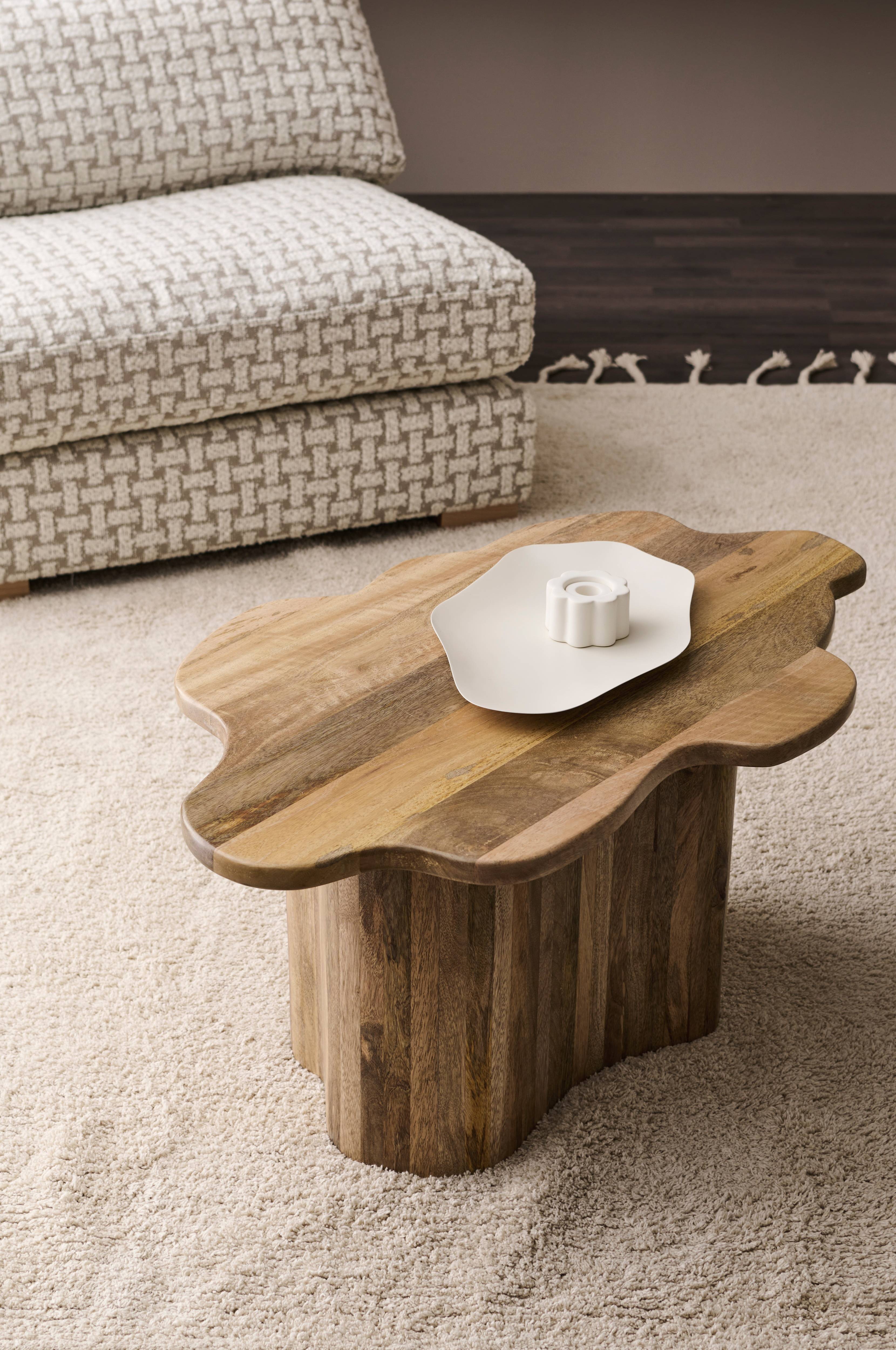 Soffbord med mjuk, organisk form. Av mangoträ med dold metallstomme. Maxvikt: 50 kg. Levereras monterat.