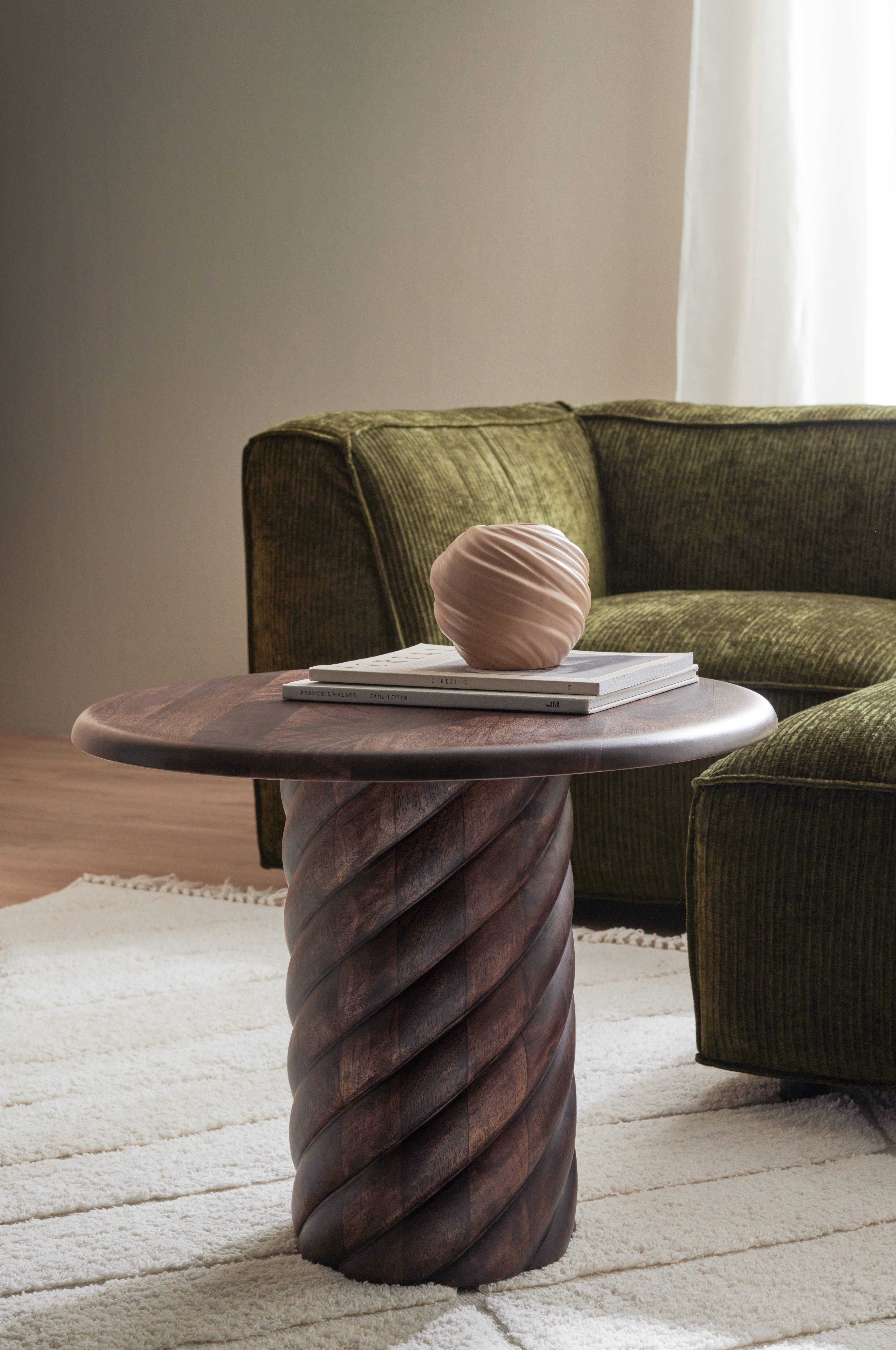Runt bord i mangoträ med vaxad yta. Rund, stabil bas med ett dekorativt, snurrat mönster.