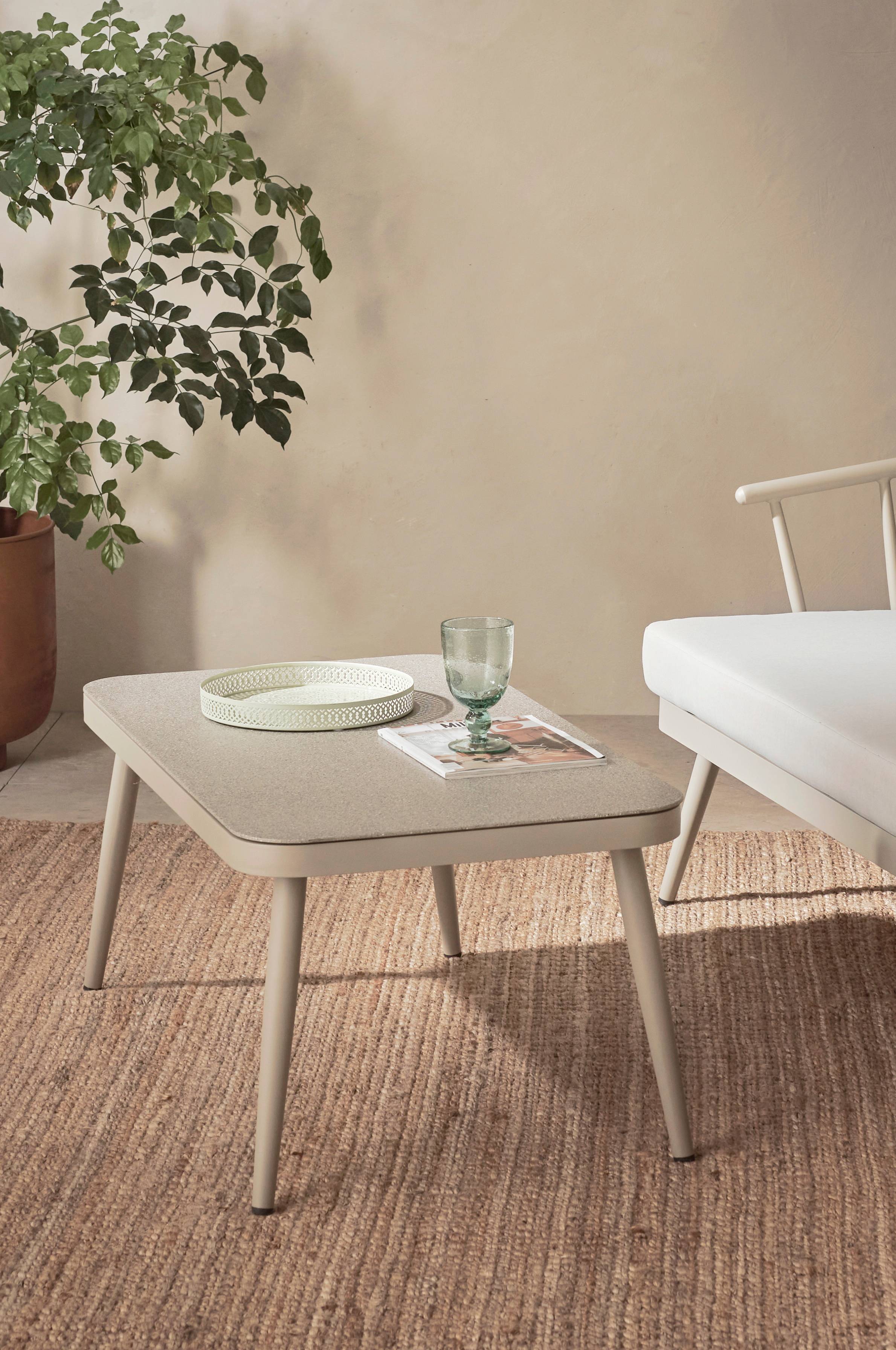 Soffbord / trädgårdsbord med ben av aluminium. Toppskiva i blästrat glas med stenlook. Kan användas utomhus.