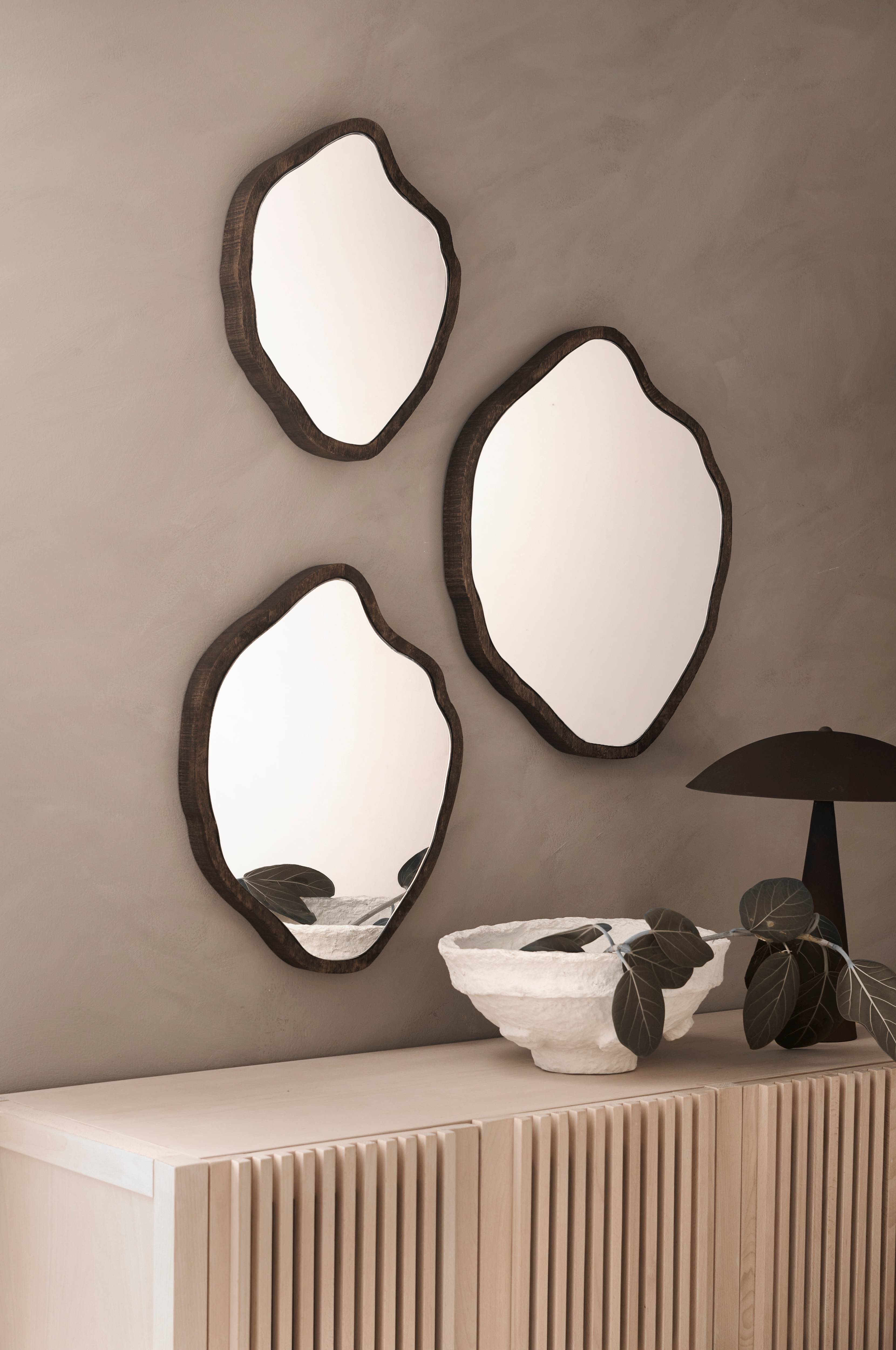 Set med 3 st matchande speglar i olika storlekar med mjuka, organiska former. Ram i brunlaserad mango och MDF samt spegelglas. Mått: Large: 55x46 cm. Medium: 49x39 cm. Small: 40x33 cm.