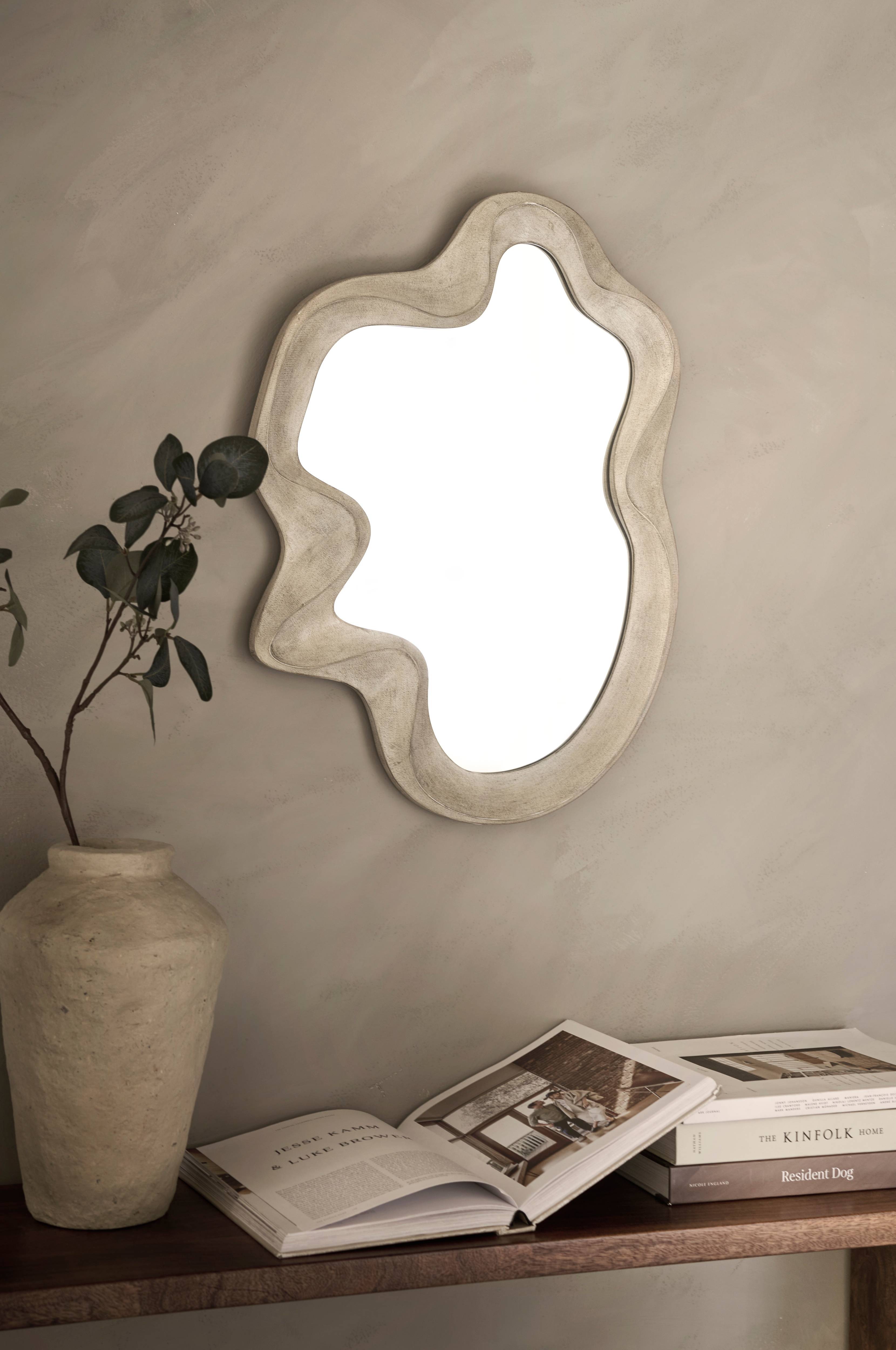 Spegel med oregelbunden, organisk form. Ram av trä. Väggfästen på baksidan.