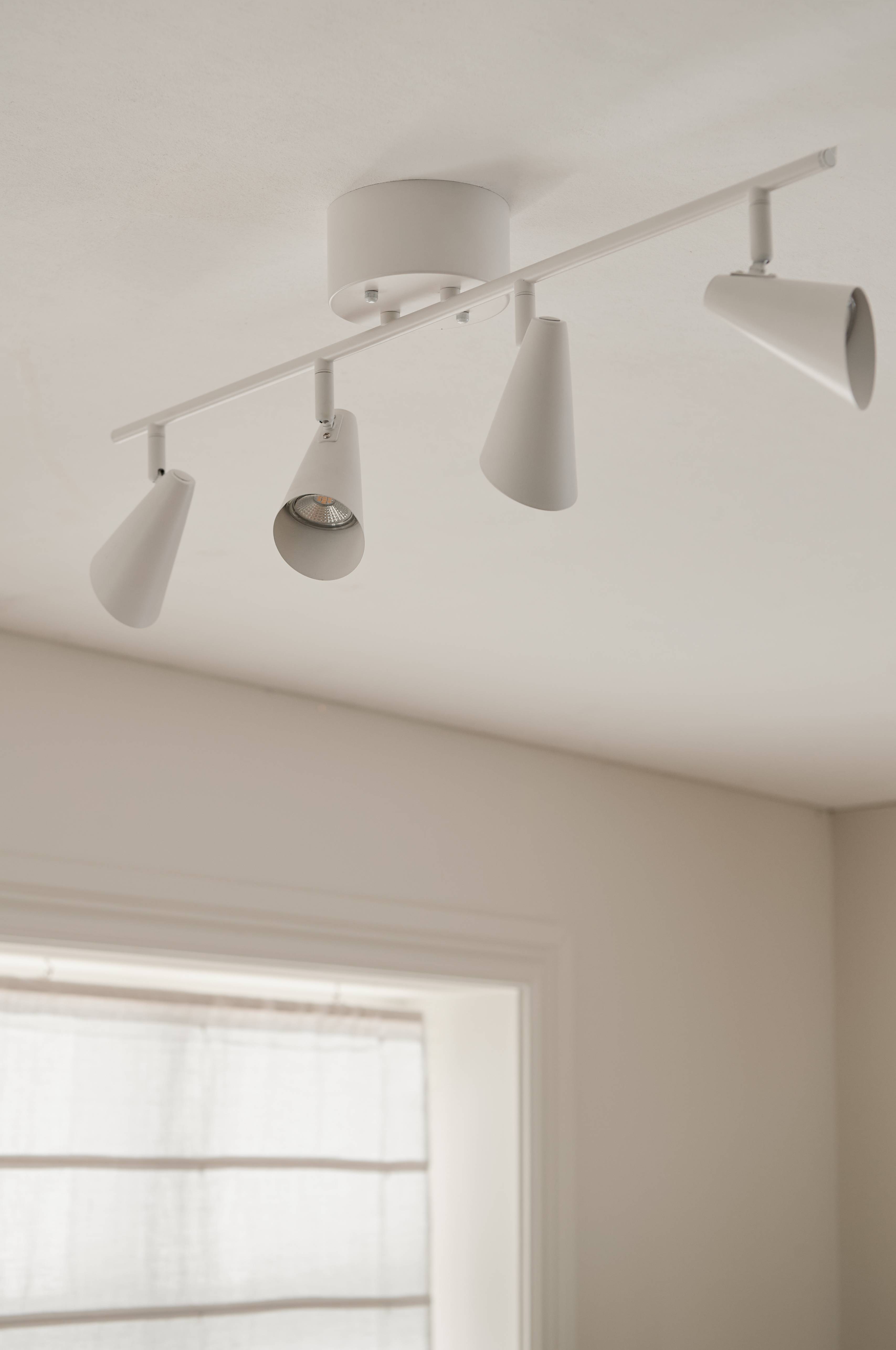 Spotskena av metall med 4 spotlights som kan vinklas. Takkoppens höjd mått: Diameter 12 cm. Höjd 6 cm. Krokupphängning. Max 10W LEDx4. Ljuskällor ingår ej. Jordad.