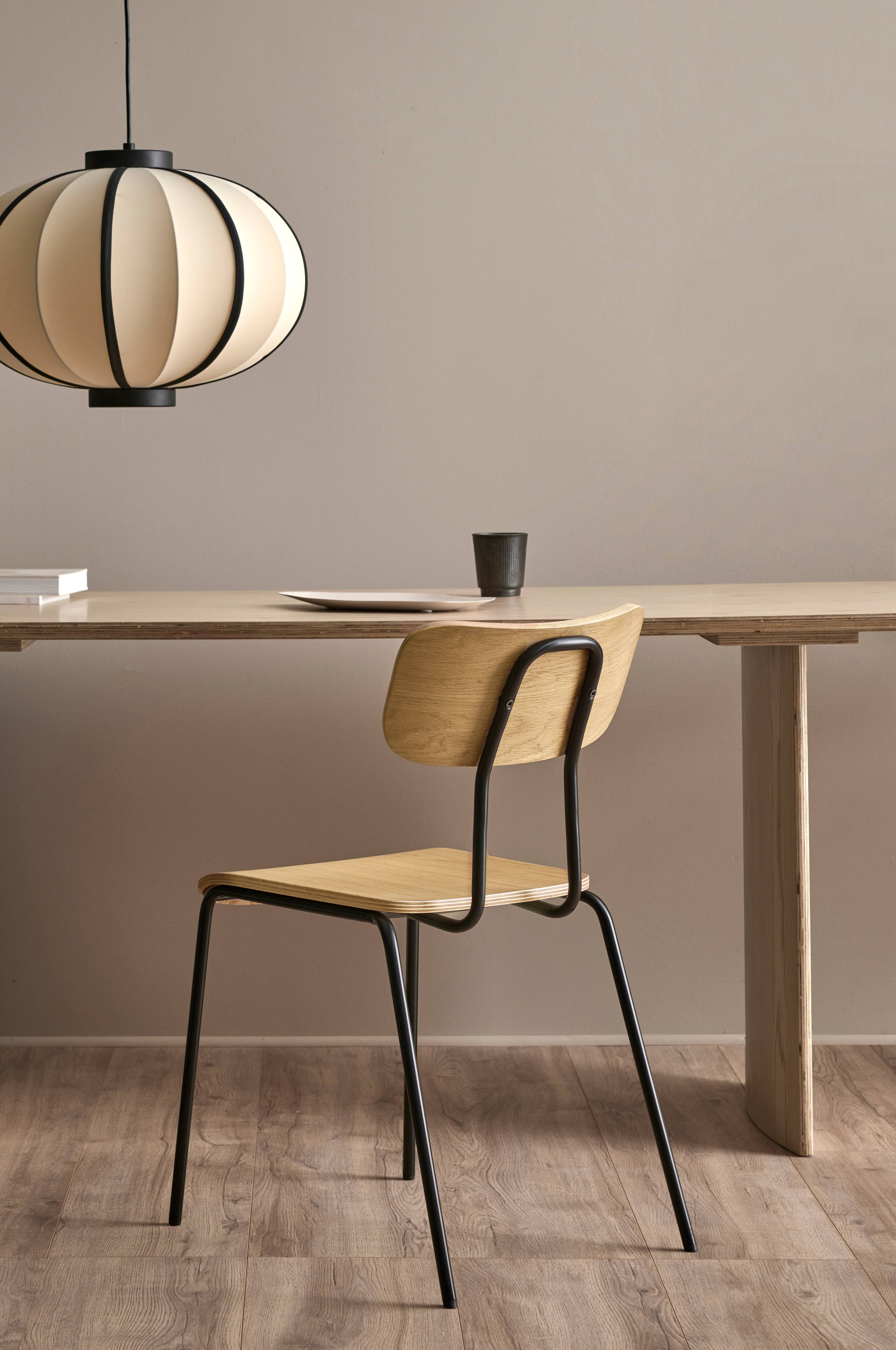 Stol med sits och ryggstöd i askfanérat böjträ. Ben och stomme i metall. Höjd 78 cm, bredd 43 cm, längd 54 cm. Sitthöjd 46 cm, sittdjup 42 cm. Enklare montering.