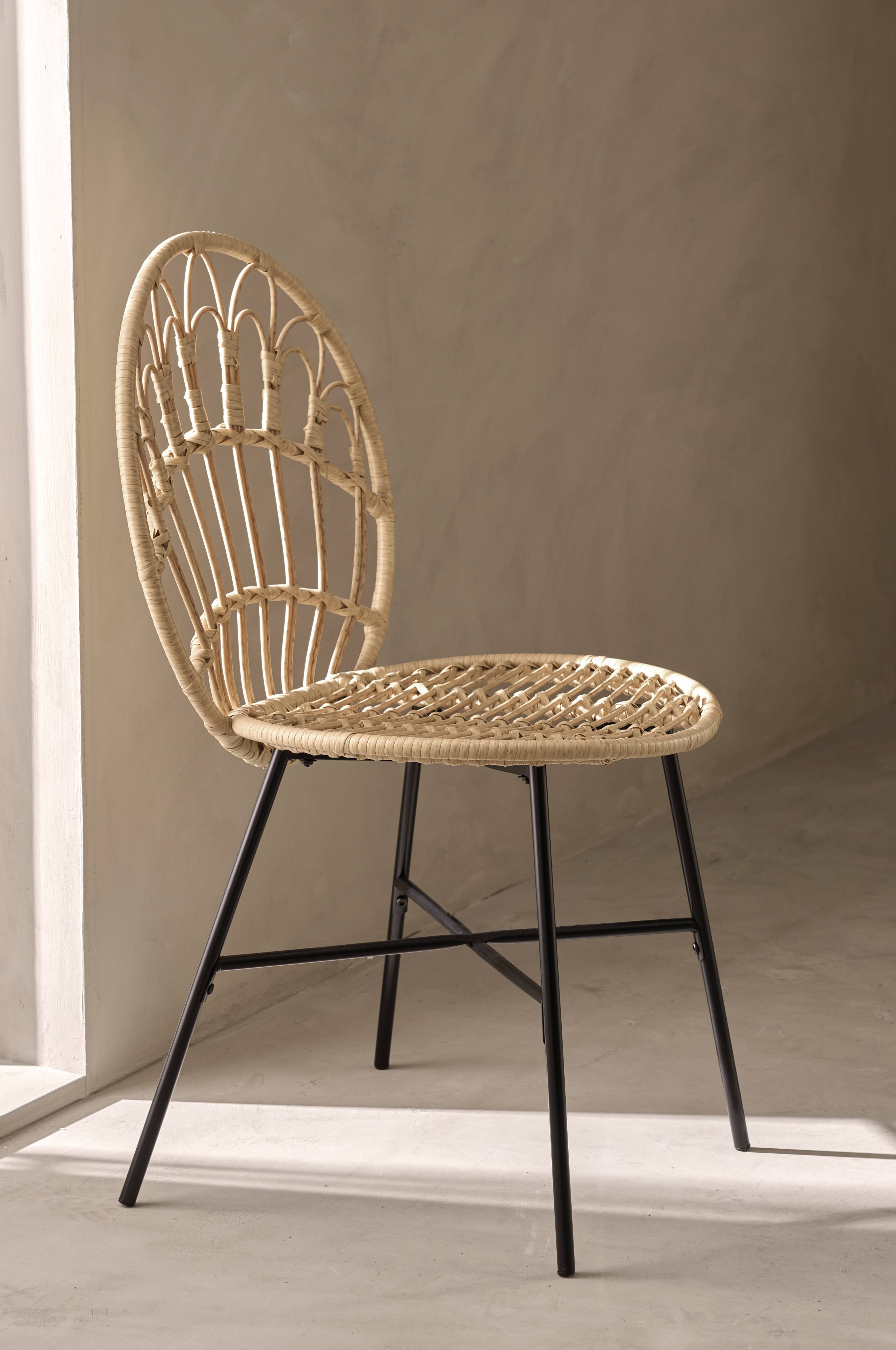 2 stolar som även kan användas utomhus. Av konstrotting. Ben i pulverlackad och rostskyddsbehandlad metall . Levereras monterade. 2-pack.