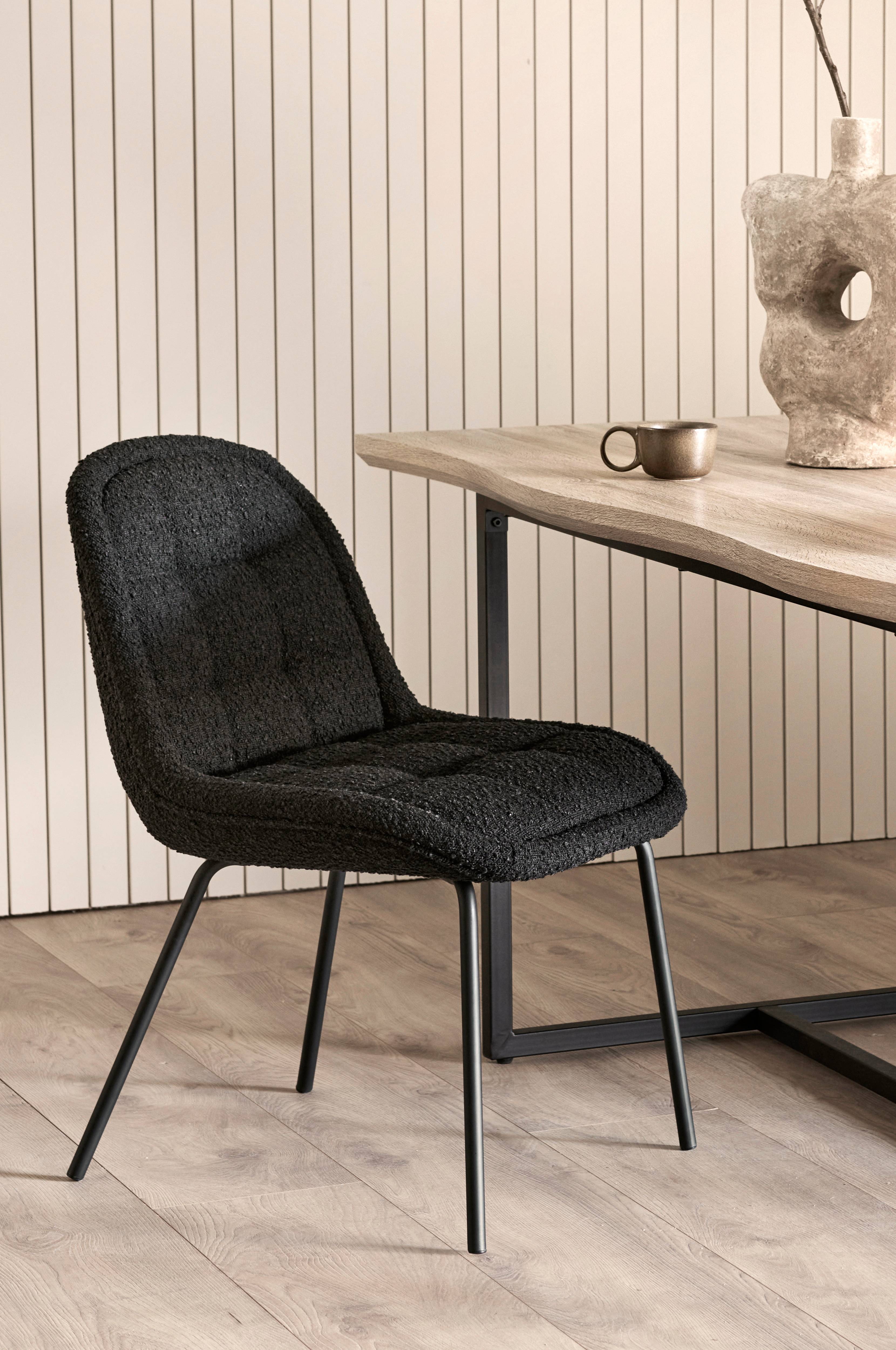 Två stolar med ben och stomme i pulverlackad metall. Klädsel i bouclétyg med indragningar på insidan av sitsen och ryggen. Enklare montering.