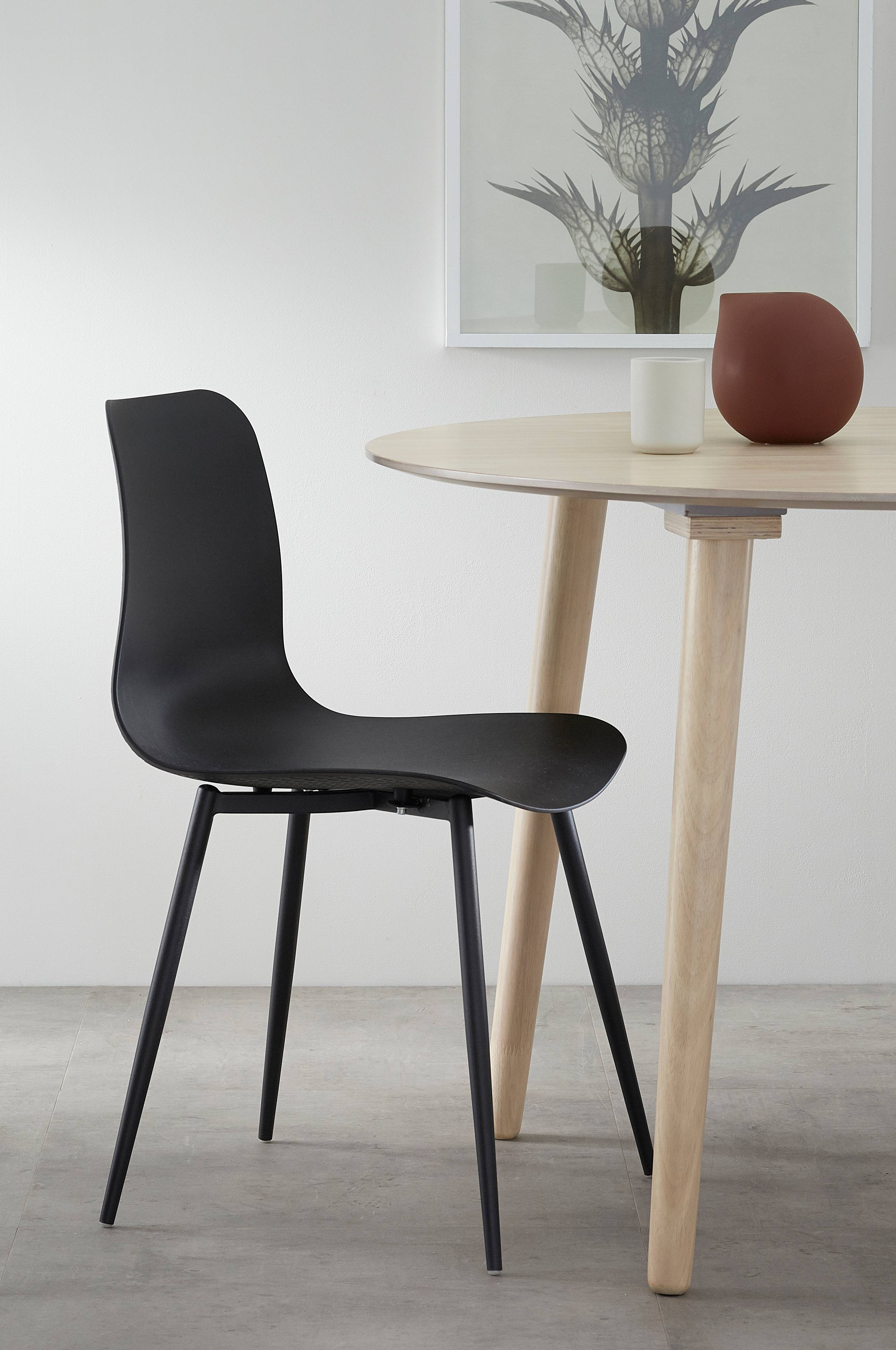 Två stolar av plast med formgjuten sits och strukturmönster i ryggen bak. Färgmatchade ben av pulverlackad metall. Höjd 80 cm, bredd 44,5 cm, djup 49 cm. Sittdjup 39 cm, sitthöjd 42 cm. Max vikt för varje stol 150 kg. Enklare montering (benen skruvas på vid leverans).